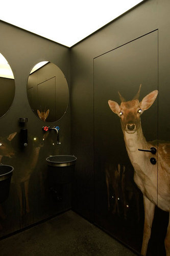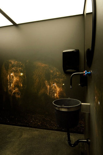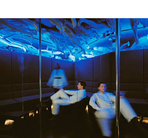 Um das dynamische Gleichgewicht zu wahren, wurde dem durch den Zugang bevorzugt gelegenen Vorderbereich ein markanter Gegenpol am hinteren Ende des Schlauches gesetzt: Zuerst ein als »Private Mystery Space« bezeichnetes Séparée, wo Spiegelwände, Effektlicht sowie an der Decke angebrachte weiße Schaufensterpuppen die Idee eines »Hinterzimmers« ins Spielerische überhöhen. Und dann noch die »Silent Wood Rooms«, ein Toilettenbereich, der durch mit Naturmotiven bedruckte Compactplatten überrascht. Ein Wechsel von der turbulenten Sphäre der Bar in die beschauliche – und für den Gast natürlich unerwartete – Stille eines nächtlichen Waldes wird inszeniert.