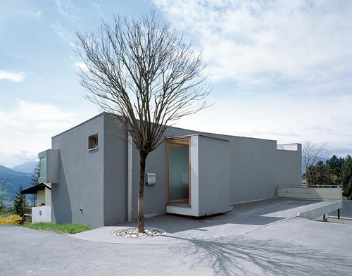 Dabei handelt es sich um kein Kleinsthaus. Die 136 m² Wohnnutzfläche sind sparsam auf drei Ebenen organisiert. Nach Osten und Norden tritt nur das Obergeschoß über Niveau in Erscheinung. Die dem Eingang an der Rückseite vorgelagerte Plattform dient als Autoabstellplatz, eine steile Rampe führt mit einem schmalen Wenderadius eine Ebene tiefer, wo es einen weiteren, nun von der Plattform gedeckten Abstellplatz für zwei Fahrzeuge gibt. Auch von hier führt ein Zugang in die mittlere Ebene des Hauses.