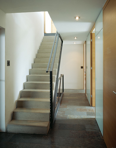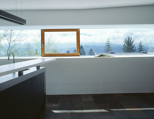 Das Stiegenhaus liegt parallel zur Nordwand. Die Funktionen Kochen, Essen und Wohnen finden Platz im großen Einraum der obersten Ebene, der nach Südwesten auf eine gedeckte Terrasse ins Freie erweitert wird. Ausblicke sind so gesetzt, dass nur die topographischen Schönheiten ins Sichtfeld gerückt werden und der Blick auf die Häuser der Umgebung sowie auch der Einblick von ihnen möglichst reduziert bleiben. Eine große Glasfront gibt es deshalb nur zur Terrasse hin. Talwärts rahmt den Panoramablick ein langer, über Eck laufender Schlitz mit tiefen, aus der Fassade auskragenden Laibungen. Und das Fenster wird zur Aussichtstheke. Nordfenster gibt es keines. Nur durch den beidseitig verglasten Windfang kommt Licht in die Eingangszone.