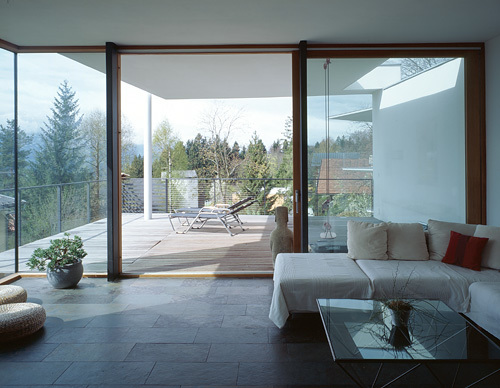 Doch was wäre ein Innsbrucker Haus ohne Blick auf die Nordkette? Den kann man ungetrübt von der Terrasse aus genießen durch einen präzise gesetzten Deckenschlitz entlang der Nordwand.