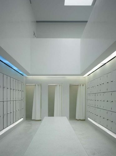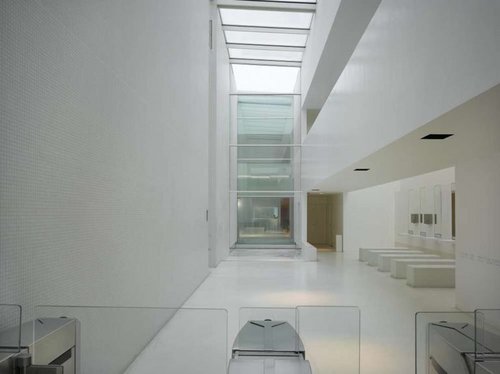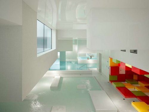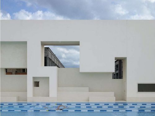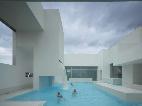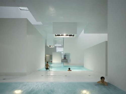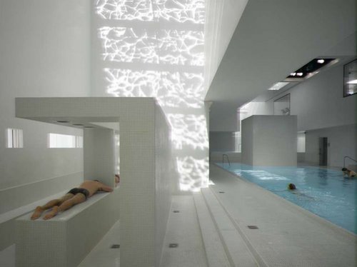 Die nach außen einfältige Kiste hat einen raffiniert ausgehöhlten Innenraum. Vorsprünge, Rücksprünge, Nischen, Absenkungen, Aufbauten – ein Negativ-Positiv-Spiel in einem Schuhkarton. Die Betonträger des Daches sind in unterschiedlichen Höhen angebracht, Deckenhöhen verspringen, die Konstruktion ist versteckt. Die Becken sind so angelegt, dass für den Besucher niemals das Bad in seiner Gesamtheit wahrzunehmen ist. Manchmal durchschreiten andere Badegäste das Blickfeld wie in einem Film: Hier ist er wieder, der cinematische Blick des Architekten, der sich durch all seine Gebäude zieht. Die Arbeit von Jean Nouvel lebt immer aus einer unerhörten, visuellen Vielfalt, die auch dieses Bad trägt. Der Besucher befindet sich in einer labyrinthischen Wasserlandschaft mit Becken unterschiedlichster Dimension, eine Landschaft, die größer erscheint, als sie eigentlich ist. Mit einem ganz einfachen Mittel wird eine klare Orientierung gewährleistet: Blickbeziehungen erfolgen ausschließlich über die Diagonale, und in der Mitte der Anlage stehen das Kinderplanschbecken und ein Trockenbad für Kleinkinder – das sind Matratzen in Rot, Orange- und Gelbtönen – die einzigen, grellen Farbtupfer im Inneren. Zenitlicht fällt auf die Becken und reflektiert sich in den kleinen weißen Mosaikfliesen, es entsteht eine mediterrane, heitere Atmosphäre.