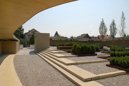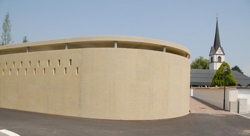 Der neue Kirchplatz nimmt die bestehende Oberflächengestaltung auf und setzt auf Verdichtung. Mit dem keilförmigen Anheben von Rasenflächen werden Sicht- und Raumbeziehungen zu den umliegenden Gebäuden verstärkt, durch die integrierten Sitzbänke und Fokussierung auf die Trauerweide der Platz aufgewertet. (Text: Martina Pfeifer-Steiner)