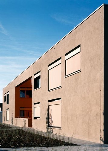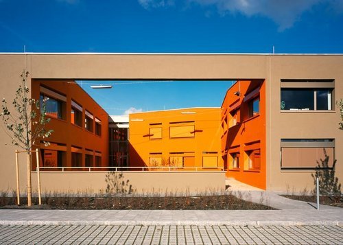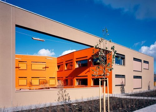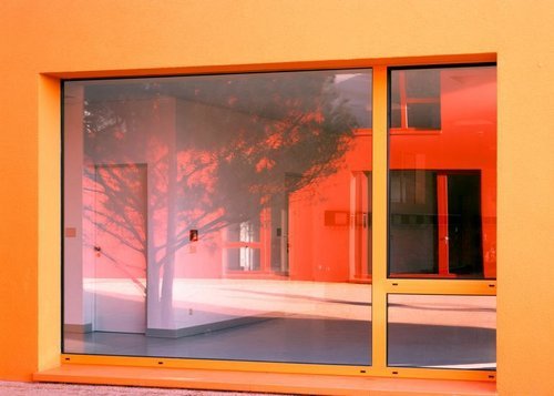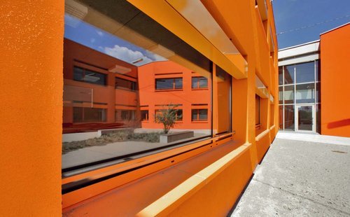 Welche Vorstellungen tauchen im Kopf bei den Begriffen Schule und Farbe auf? Da sind vor allem Foyers, die von vielerlei Kunsterziehungsprodukten verklebt und verstellt sind – kein besonders positives Gefühl, eher die Assoziation an rigoros in Bahnen gelenkte Kreativität. Da tut es gut, wenn ein Gebäude – professionell farbig gefasst – signalisiert: Hier bin ich, hereinspaziert, ich biete Anregung, wecke Neugier, sorge aber auch für Geborgenheit. Alles Aspekte, die man mit dem Farbspektrum Orangerot verbindet. Keine Villa Kunterbunt, sondern sorgfältig aus dem örtlichen Kontext entwickelte Architektur und ein ebenso sorgfältig konzipiertes Farbkonzept.