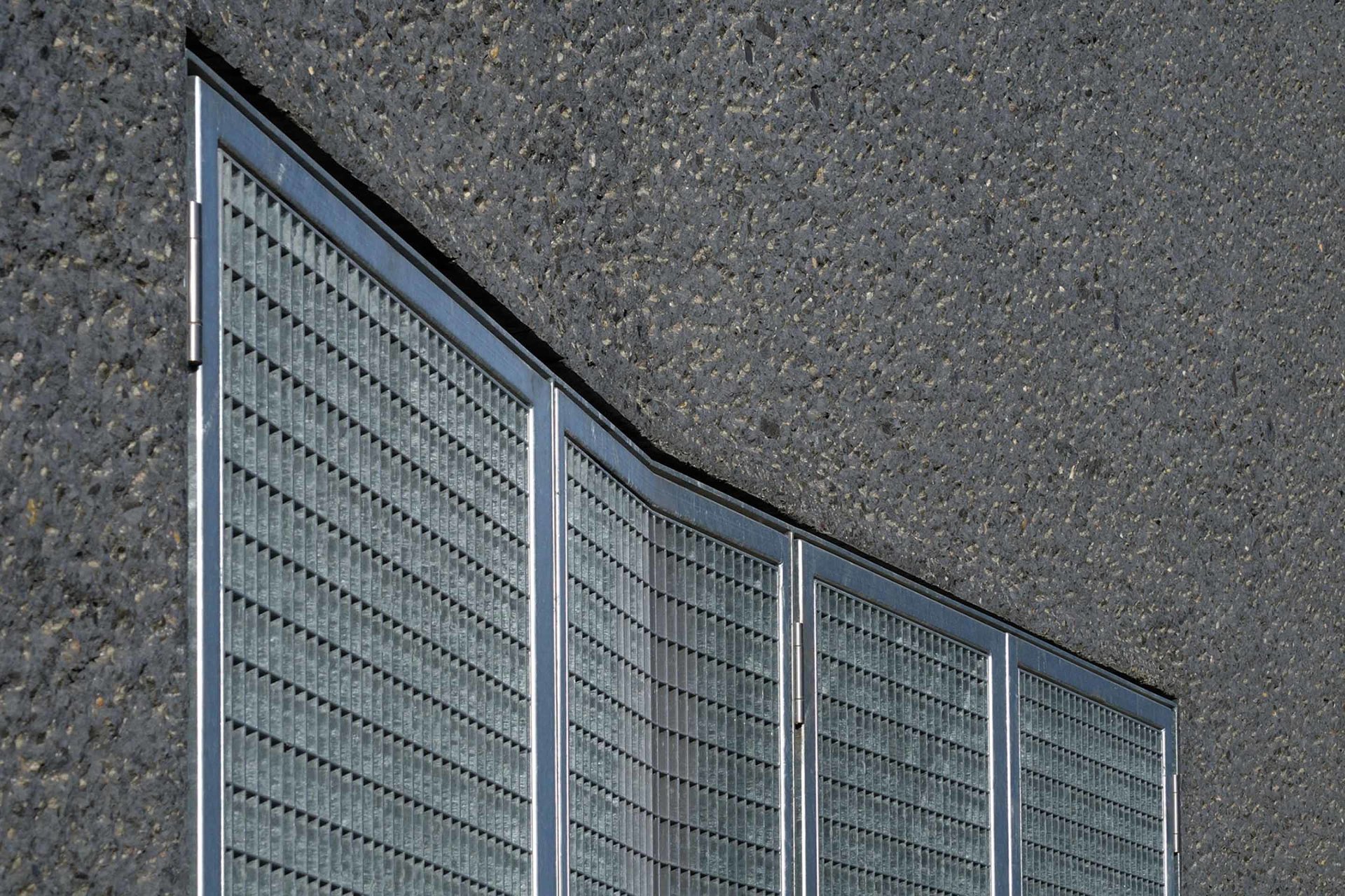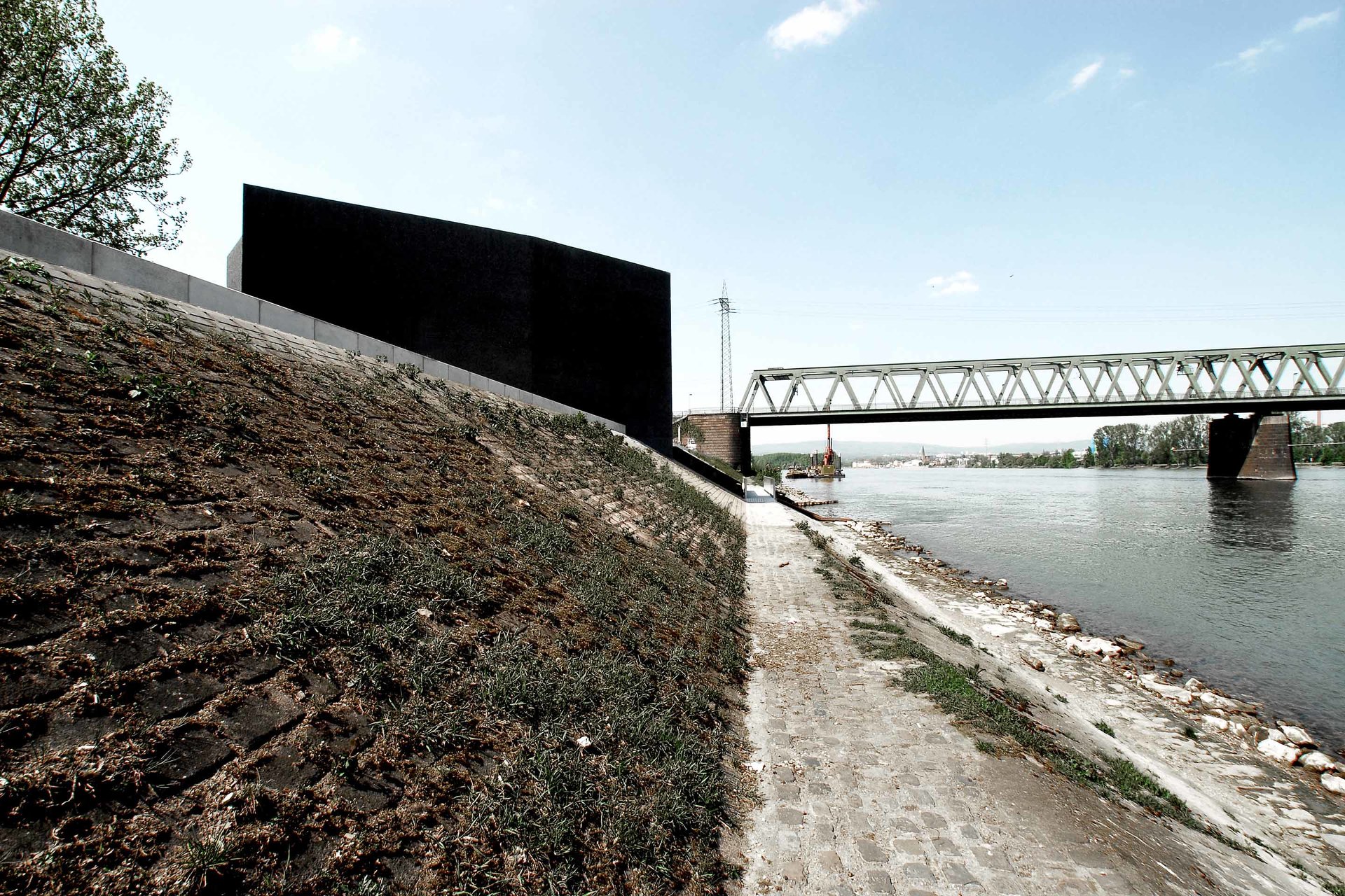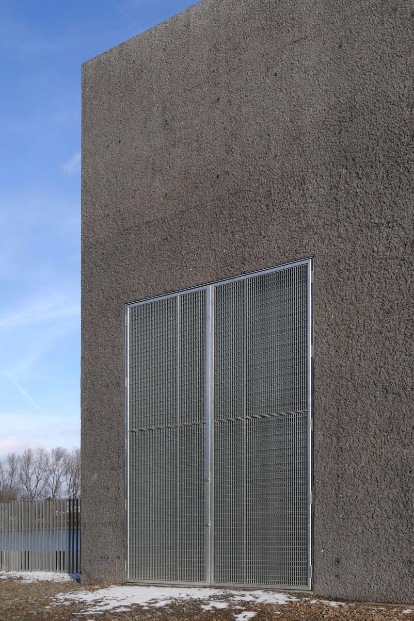 Betriebsgebäude gehören zur technischen Infrastruktur einer Stadt und üblicherweise werden diese ohne jeglichen Gestaltungsanspruch erstellt, in der kurzfristigen Annahme, somit wirtschaftlicher zu bauen. Diese belanglosen Gebäudehüllen bilden oftmals die Grundlage für Verwahrlosung und Vandalismus. Sie verursachen stetige Renovierungskosten, ohne jemals eine tatsächliche Qualität zu erreichen. Daher entschied sich der Auftraggeber, die Stadt Mainz/Wirtschaftsbetrieb, an der Rheinuferpromenade des künftigen neuen Stadtquartiers Zollhafen für eine nachhaltige Gestaltung. Es gibt keine Typologie für Pumpwerke. Den Architekten war es dennoch wichtig ein Gebäude zu entwerfen, welches die Gebäudefunktionen Hochwasserpumpwerk, Auslassbauwerk und Wehranlage thematisiert. Der fenster- und fugenlose Baukörper ist im Sinne der architecture parlante (C.N. Ledoux 1736-1806) lesbar als purer, schwerer Monolith, welcher auf einer großen Wasserader lagert und den Strom reguliert: Auf der Berme (horizontaler Absatz in der Dammböschung) überspannt eine Fußgängerbrücke das geöffnete Auslassbauwerk. Von dieser Brücke aus ist der tiefe Raum des unterirdischen Gebäudeanteiles sichtbar, mit den Pumpenschächten und der Hubwehranlage. Der Betrachter erahnt, welche Wassermassen hier im Bedarfsfall anfallen. Die Oberfläche des anthrazitfarbenen Betonkubus mit gekanteten Seitenflächen und Traufkanten wurde vollflächig steinmetztechnisch bearbeitet (gespitzt). Durch die 30mm tiefe Rauheit der Oberfläche erinnert nichts mehr an eine konventionelle Bauentstehung. Die geknickten Flächen inszenieren den Sonnenverlauf mit hellen und verschatteten Flanken. Die Oberflächenrauheit verstärkt dieses Spiel in der Wechselwirkung von Streiflicht, vollflächiger Ausleuchtung, zu erneutem Streiflicht und Schatten. Die wenigen, rein technischen Anforderungen geschuldeten, Gebäudeöffnungen werden bündig zur Oberfläche mit verzinkten Stahlgitterrosten geschlossen. Das flache Dach entwässert direkt über die Fassade zum Auslassbauwerk - es wird sich eine Vermosung dieser Fassade einstellen. Das Altern der gesamten Oberflächen ist Entwurfsbestandteil, d.h. das Bauwerk wird zunehmend seine konstruierte Erscheinung und zeitliche Zuordenbarkeit verlieren. (Text: Architekt)