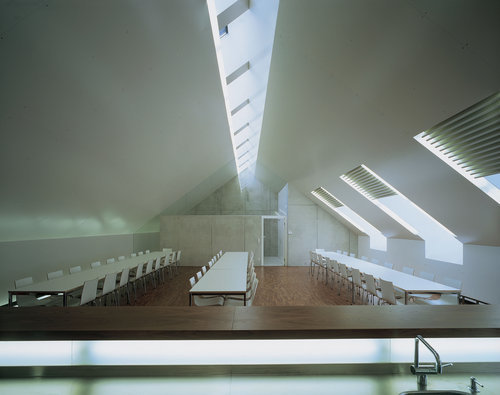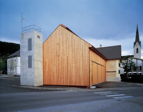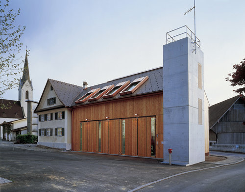 Der klar geformte, nördliche Anbau birgt Fahrzeughalle, Werkstätten und die Nebenräume. Die schmale, vertikale Holzverschalung zitiert auch in der Materialität „Stall, Scheune“. Die Oberlichten der Schulungsräume und Lüftungselemente sind aus Kupfer und Glas, fügen sich in die dunkle, mit Biberschwanzziegeln gedeckte Dachfläche ein. Die innere Konstruktion, Wand und Deckenoberflächen sind in Sichtbeton ausgeführt. Der markante Schlauchturm wird in dieser Dorfplatzsituation niedrig gehalten, indem er unterirdisch angebunden ist. (Text: Martina Pfeifer-Steiner)