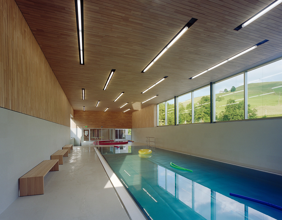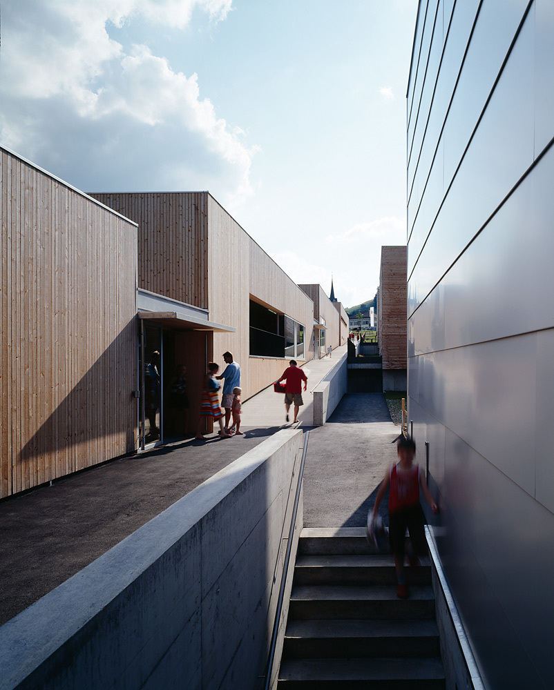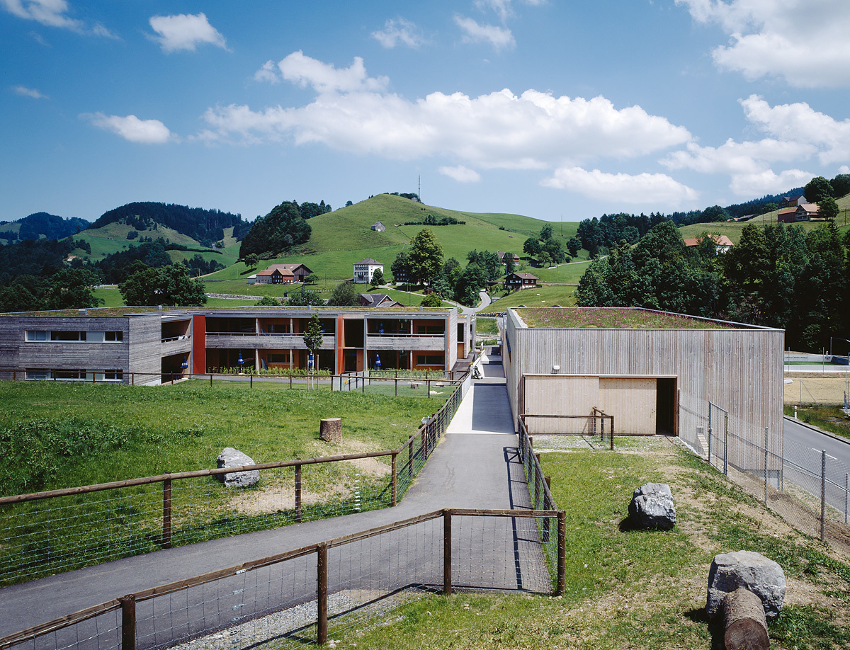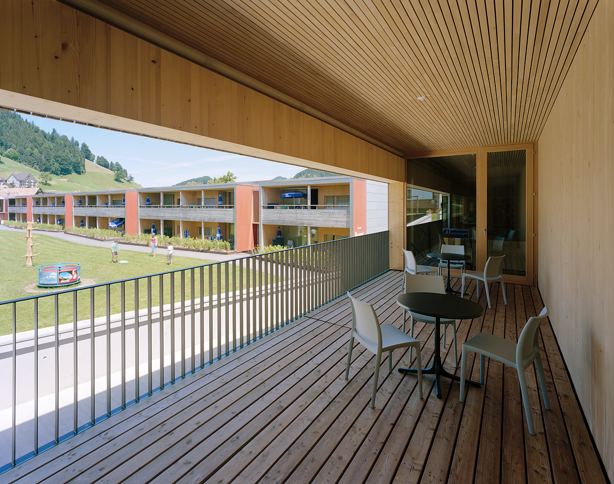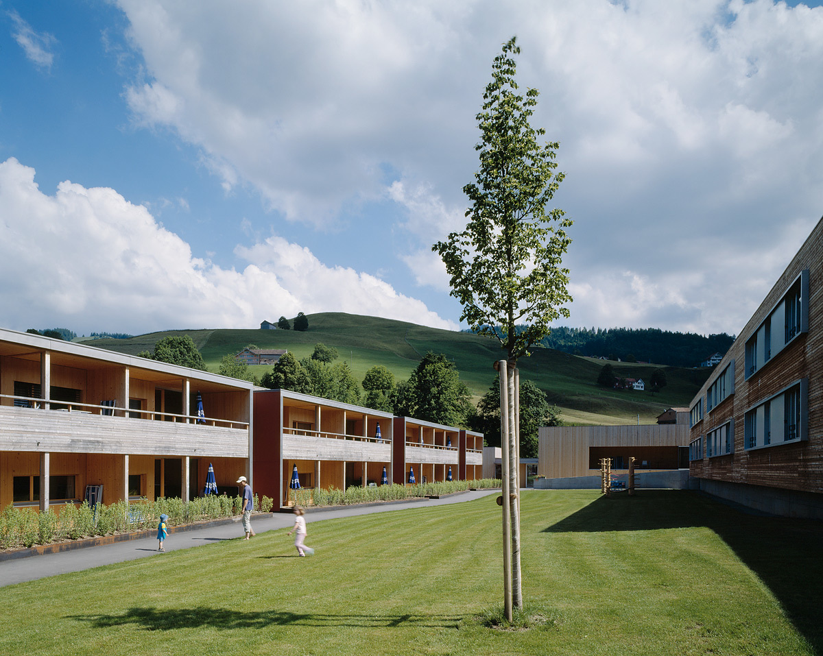 Der Kontakt mit diesen Tieren und ihre Betreuung gehören zum Konzept des Feriendorfes. Hinter den vier Gemeinschaftshäusern verläuft über Rampen die interne Hauptachse der Siedlung. Die Wege zu den Ferienwohnungen zweigen davon rechtwinklig ab. Daran reihen sich in drei abgewinkelten, zweigeschossigen Baukörpern die Wohnungen mit zwei, drei, vier und fünf Zimmern, sodass zwei weitgehend geschlossene und ein halb offener Wohnhof gebildet werden. An einem Treppenhaus liegen im Erdgeschoss und im Obergeschoss je zwei Wohnungen. Ihre Grundrisse sind flächenmäßig optimiert, entsprechen aber in der Struktur normalen Familienwohnungen, die an der West- bzw. Südseite über breite Sonnenterrassen verfügen. Über den Untergeschossen und Gebäudesockeln aus Stahlbeton erhebt sich eine Holzkonstruktion, wobei dem Brandschutz großes Gewicht beigemessen wurde. Die Flachdächer sind extensiv begrünt, sodass die Siedlung, die meist schräg von oben zu sehen ist, gut in die Umgebung integriert wird. (Text: Architekten)