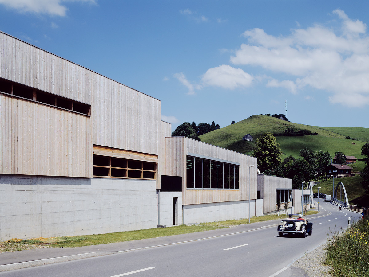 Im Süden führt die Kantonsstraße an der Siedlung vorbei. Hier schirmen die vier dem Gelände folgenden Gemeinschaftshäuser die dahinterliegenden Wohngebäude und -höfe von Lärm und Staub ab. Eine Unterführung erlaubt den gefahrlosen Zugang zu den Spielflächen und zum Badeplatz an der Urnäsch. Die Zufahrt zum Feriendorf erfolgt an der Ostseite, wo der Parkplatz und unter dem ersten Wohntrakt ein Parkdeck angeordnet sind. Die Zeile der Gemeinschaftsbauten weist ebenerdig im Osten den Haupteingang mit der Rezeption auf. Daneben befindet sich der Jugendraum, ein multifunktionaler Saal mit der Gemeinschaftsküche, der für Veranstaltungen vorgesehen ist. Im nächstliegenden Haus sind der Kindergarten, die Schulküche, die Bibliothek und der Fernsehraum untergebracht; im Untergeschoss liegen die Garderoben für das Schwimmbad, das im dritten Haus zugänglich ist. Im vierten Haus ist für fünf Kleintierarten in ihren Ställen Platz.