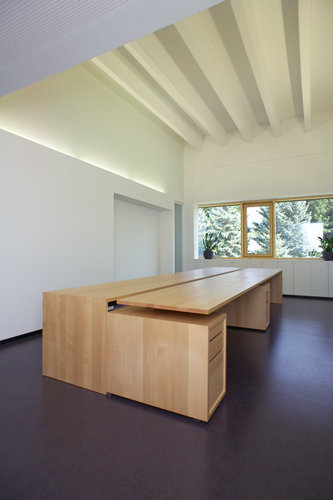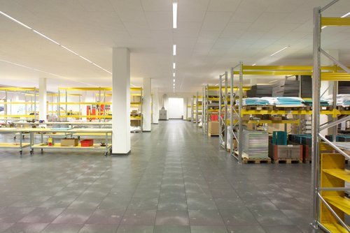 Alle Wünsche des neuen Nutzers werden dank der bestehenden neutralen Gebäudestruktur optimal umgesetzt. Im Erdgeschoß befinden sich nun die gesamten Produktions- und Nebenraumflächen, im Obergeschoss Lager, Kleinteileproduktion und Verwaltungstrakt, der über die neue, zweigeschossige Eingangshalle und die repräsentative Stahlwendeltreppe erschlossen wird. Die Büros wechseln von Einzel- und Gruppenraumbüros entlang der Ostfassade. Ein großer Schulungsraum ist vorgesehen, der in Verbindung mit Foyer und Eingangshalle für verschiedene Veranstaltungen nutzbar ist.