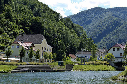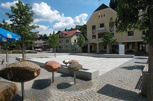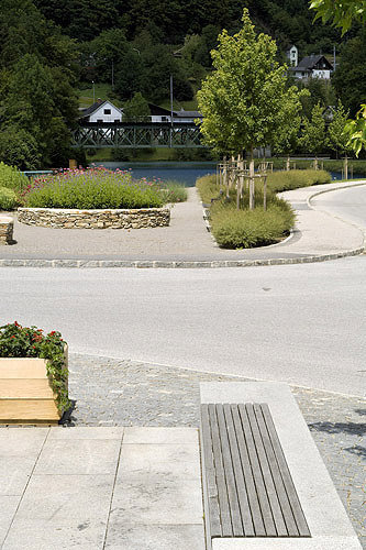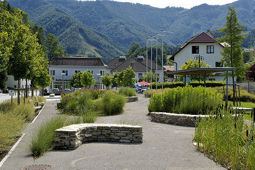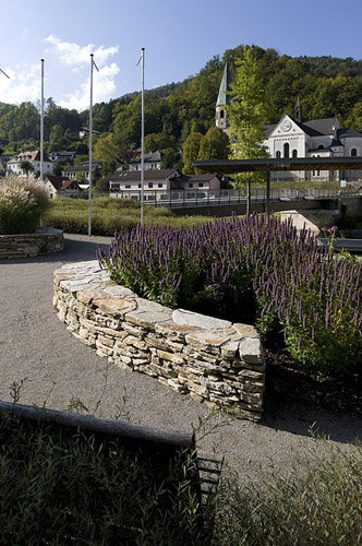 Freibereiche unterschiedlicher Prägung laden zur Inbesitznahme ein: der Platzraum mit Bänken, schattenspendende Bäume und der Brunnen mit künstlerisch bearbeiteten Steinen aus dem Reichramingbach (Künstler: Alois Lindenbauer, Weyer); weiters der angrenzende Gastgarten; der Sängerpark mit Pavillon am Flussufer und ein Schilfgarten, der den Ortsplatz assoziativ mit dem Fluss verbindet. (Text: Architekten)