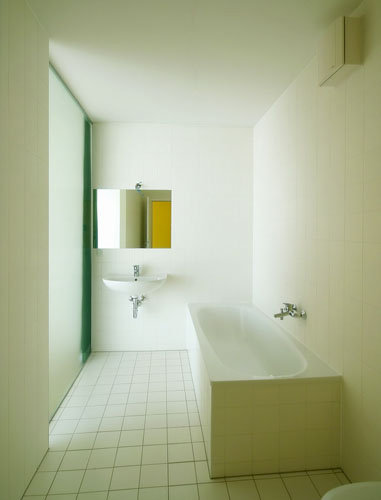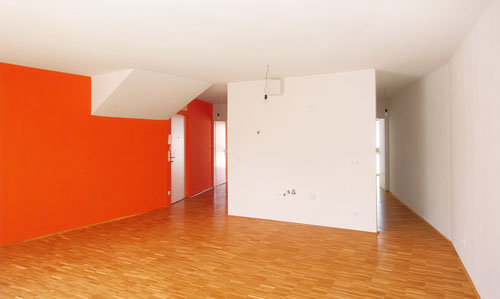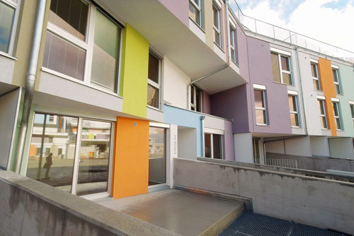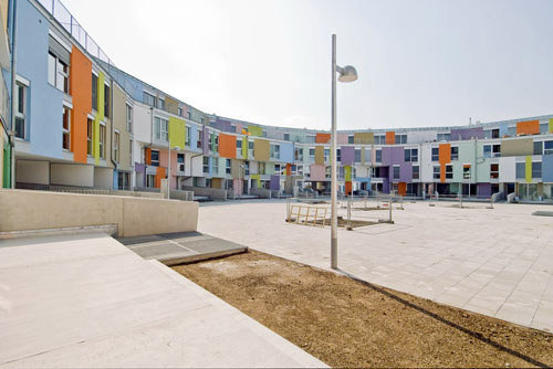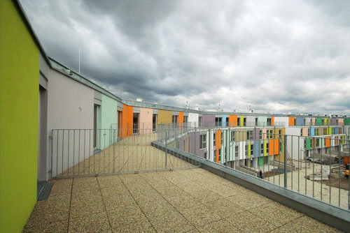 Zwölf Farben kamen für die Fassade zum Einsatz. Das Farbkonzept hat in den Wohnungen seinen Ursprung: Die Innenwandfarbe – eine Wand wurde mit einem Farbton gestrichen– zieht sich nach außen auf die angrenzende Fassade. Der Eingriff in den Wohnraum schien einem der zwei Bauträger zu gewagt, er verzichtete auf die Farbgestaltung seitens der Architekten in den Wohnungen. Bei den Wohnungen des zweiten Bauträgers beließen beachtliche 80% der Bewohner die von den Architekten gewählte „starke“ Farbe im Wohnraum.