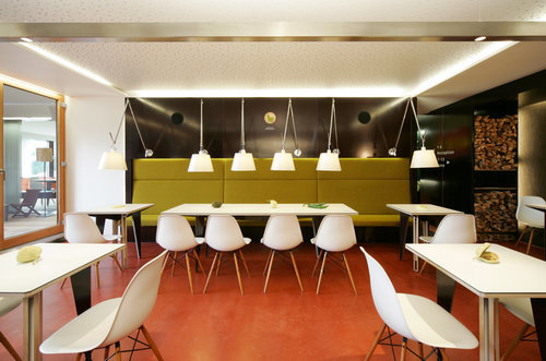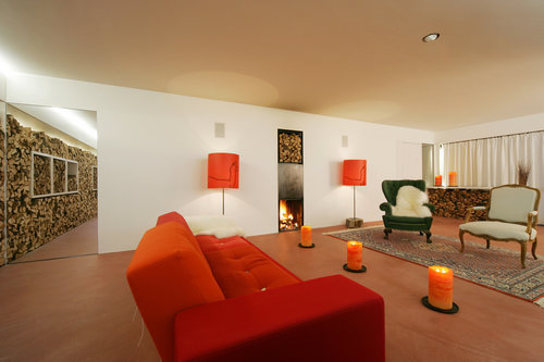 Das großzügige Raumgefühl lebt vor allem durch den starken Bezug zur spektakulären Landschaft draußen. Viel Glas, große Fenster, Terrassen, Zwischenbereiche erweitern die Zimmer in die Natur. Jedes Apartment hat einen offenen Kamin, natürlich auch alle gemeinschaftlichen Aufenthaltszonen. Für die ferienhafte, ungezwungene Gemeinschaft wird viel geboten. Zentraler Ort ist der Salon mit großer Küche. Der Wohn- Spielraum im unteren Geschoß bietet Videoleinwand und viel Platz für kommunikative Kaminabende. Die Sauna vereint auf kleinstem Raum alles: Eine Relaxliegefläche liegt auf Gemeinschaftssauna und Erlebnisdusche. In einem Labyrinth wird jede Nische mit Funktion gefüllt.