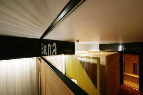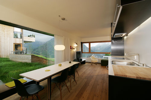 Die Vielschichtigkeit beginnt bei der Hauszugang-Situation. Die Straße leitet förmlich ins Wohnambiente. Der Blick nach oben gibt Sicht ins Innere und auf die Terrassen frei, die wiederum hemmungslos das Szenario und Kulisse der Bergwelt nutzen. Wie in einer Schiffskajüte wird Raum optimiert. Durch kluge Einteilung wird jedes Appartement zum Raumwunder. Vierzig Quadratmeter, zum Beispiel, vereinen eine großzügige Wohn- Esssituation mit den zwei Betten in der Nische, ein eigenes Schlafzimmer mit Badewanne.