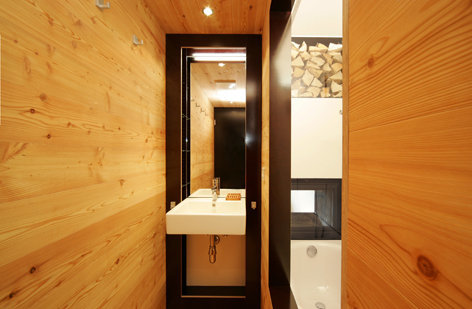 Badezimmer sind ein spezielles Thema. Witzige Lösungen, immer luxuriös mit Wanne, bis zum letzten Quadratmillimeter ausgerechnet, inspirieren und machen Ferienlaune. Wie das schwebende Bad über der Küche, mit Ausblick auf TV im Wohnzimmer. In den Einbaumöbeln aus braunen Betonschalungsplatten eröffnen sich Riesenkästen, bündige Schubladen und versteckte Türen zu weiteren Regalen.