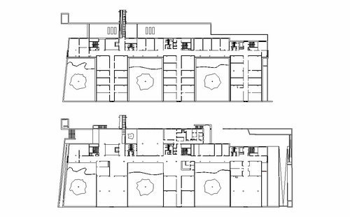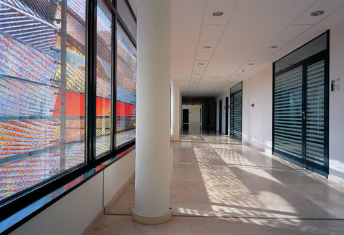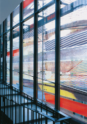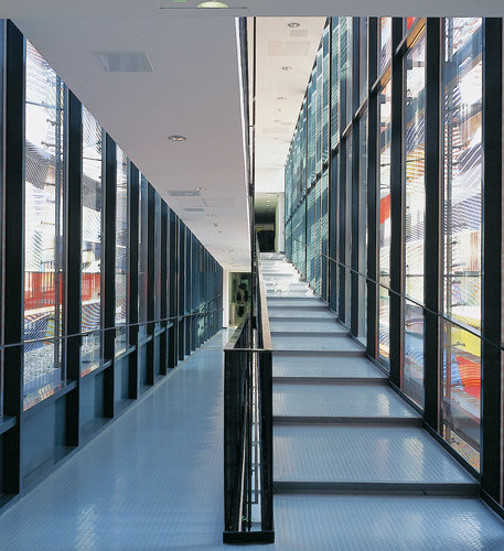 For the pattern of the prints on the glass surfaces we scanned bird’s feathers enlarged hundred times of the original size. The result is a colorful facade carrying a secret message of the special function of the building. On the other hand it gives a unique atmosphere to the corridors employees use not only to reach their offices but meet and chat with each others. (architects' text)