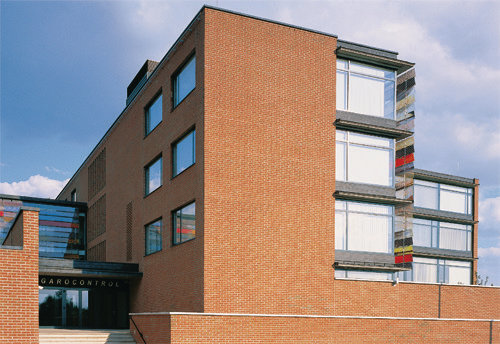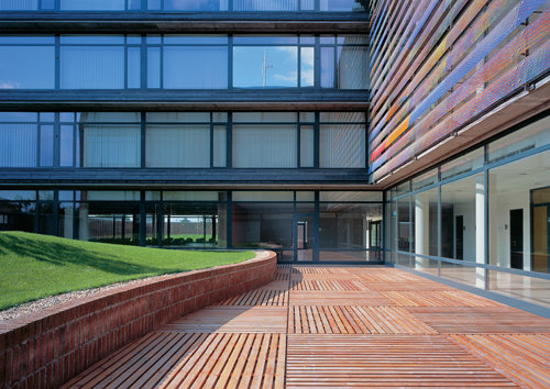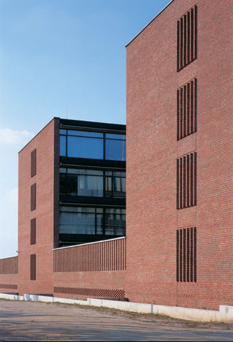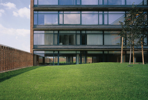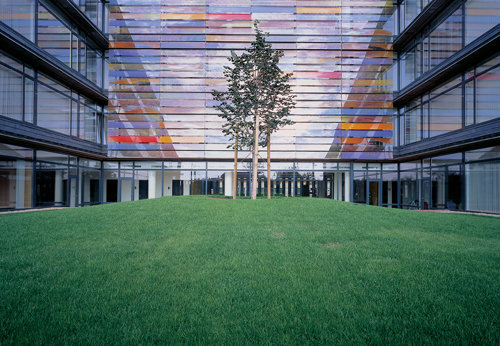 Our major design effort was to create working places facing toward quiet and green courtyards, developing a city in the city with its own identity. This very special identity is emphasized by the glass shading system which covers the glazed circulation areas including the three-story high glass bridge connecting the two buildings.