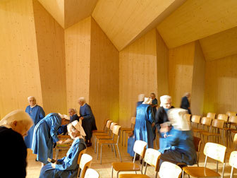 Die Arbeitsgemeinschaft Bureau d’architecture Danilo Mondada und Localarchitecture gewann den Wett -bewerb und plante daraufhin die Ausführung. Für die Zeit des Umbaus – von Sommer 2008 bis Ende 2009 – musste jedoch eine provisorische Lösung für die täglichen Gottesdienste der Diakonissen gefunden werden. Das Anmieten von Baucontainern oder eines Zeltes empfanden sowohl von die Bauherrinnen als auch von die Architekten als unangemessen. Weil Holz schon immer ein bevorzugtes Baumaterial von Localarchitecture war – ihr Stall in Lignières wurde 2006 mit dem Preis Holz 21 ausgezeichnet – und weil die Architekten sich für die Forschungsarbeiten am IBOIS interessierten, schlugen sie den Diakonissen vor, gemeinsam mit den Planern von Shel eine innovative Lösung für die provisorische Kapelle zu finden. So stiessen diese im Dezember 2007 zum Planerteam. Schon die ersten Papiermodelle über-zeugten die Schwesterngemeinschaft von der Angemessenheit einer solchen Lösung, und innerhalb weniger Wochen konnte ein definitives Projekt erarbeitet werden.