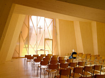 Die Verbindung der vertikalen Elemente des Faltwerkes wurde mit gefalteten Lochblechen und Schrauben bewerkstelligt. Innen sind die Platten roh belassen, die Aussenhaut besteht aus einer Dichtungsbahn und 19 mm starken, imprägnierten Dreischichtplatten. Die beiden «Giebelwände» bestehen aus unregelmässigen Kantholzrahmen, auf denen innen ein transparentes Polykarbonat und aussen ein Windschutztextil angebracht ist. Formal erinnern sie an klassische Kirchenfenster, doch ihr Nutzen ist auch praktisch: Die Maschenweite des Textils verhindert Einblicke und garantiert die Intimität des Gottesdienstes – von innen her gesehen scheint sich die Landschaft in ein impressionistisches Bild aufzulösen.