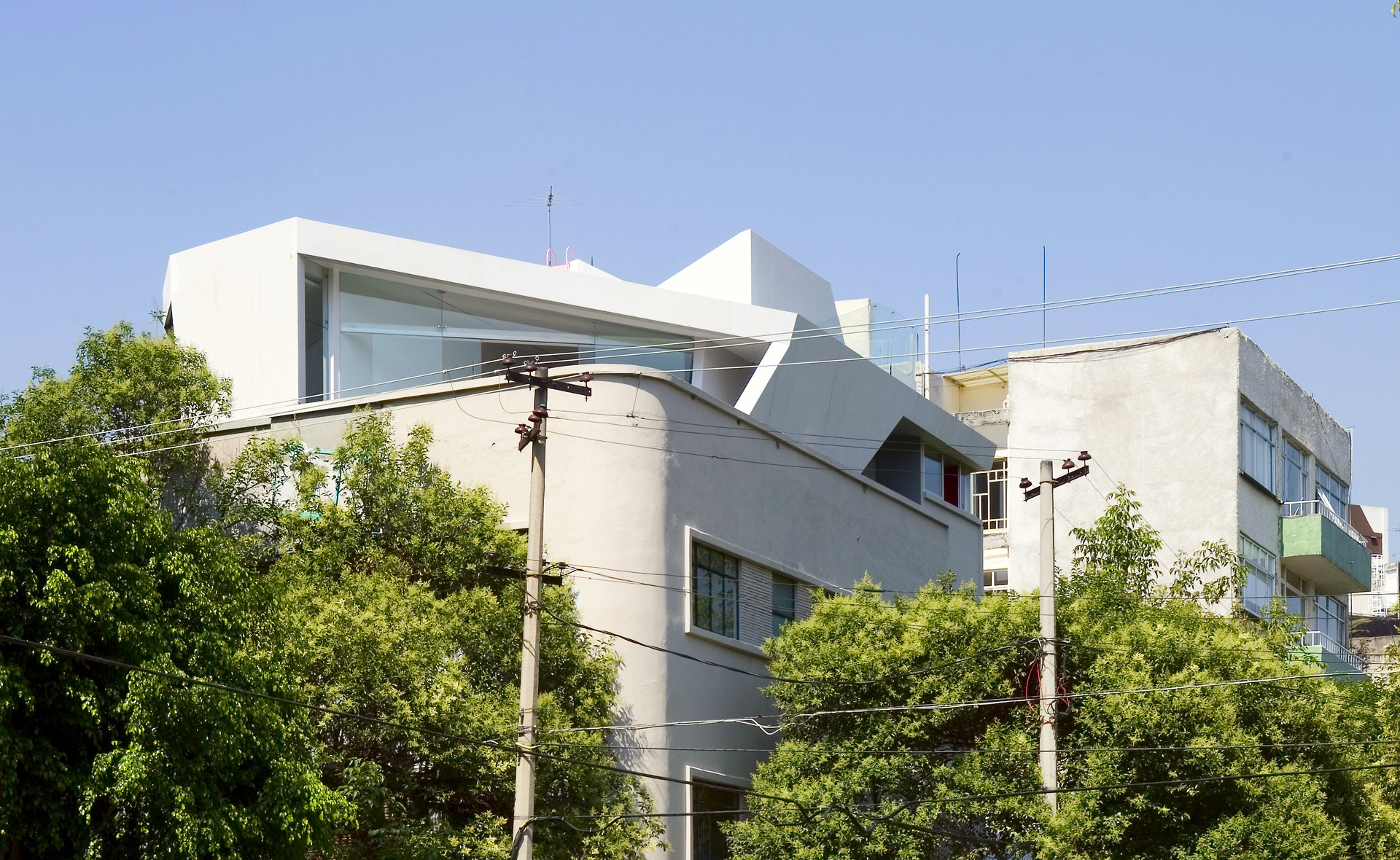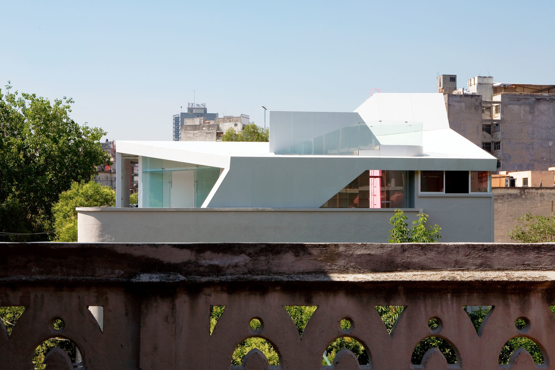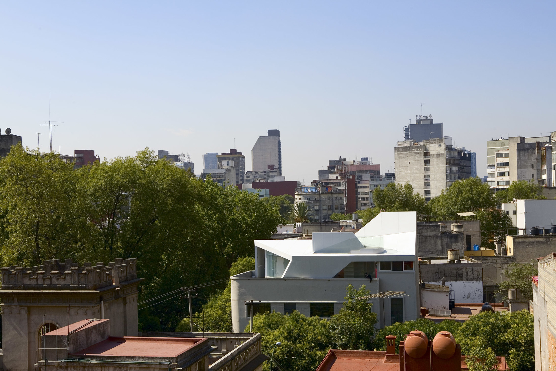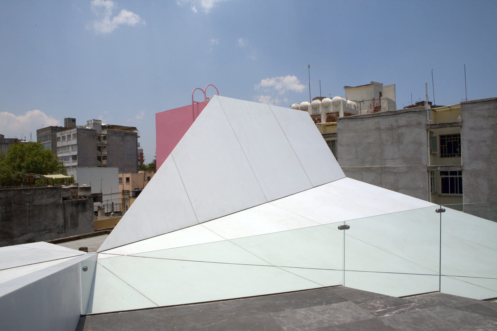 Als Kurt Sattler, ein befreundeter Architekt aus Wien, eines Tages zu Besuch war, nutzte dieser die Gunst der schrecklichen Erkenntnis und überzeugte Okón von einem professionellen Umbau. Ein ordentliches Penthouse musste her. Und so flog Sattler zurück nach Österreich, scharte seine beiden Büropartner Richard Klinger und Andreas Frauscher um sich, und entwarf ein faltiges Dachgebilde aus typisch mexikanischem Santo-Tomás-Marmor und gräulich weißem Corian.