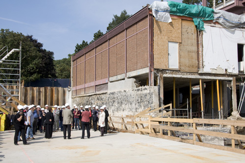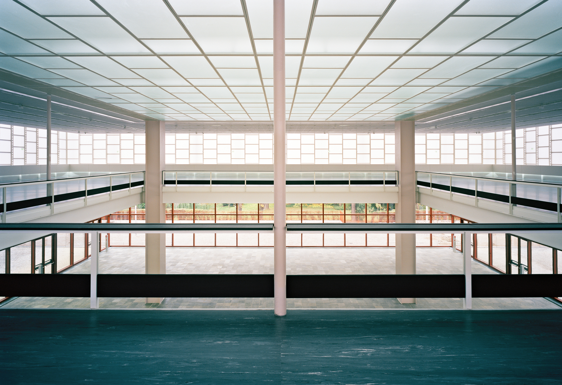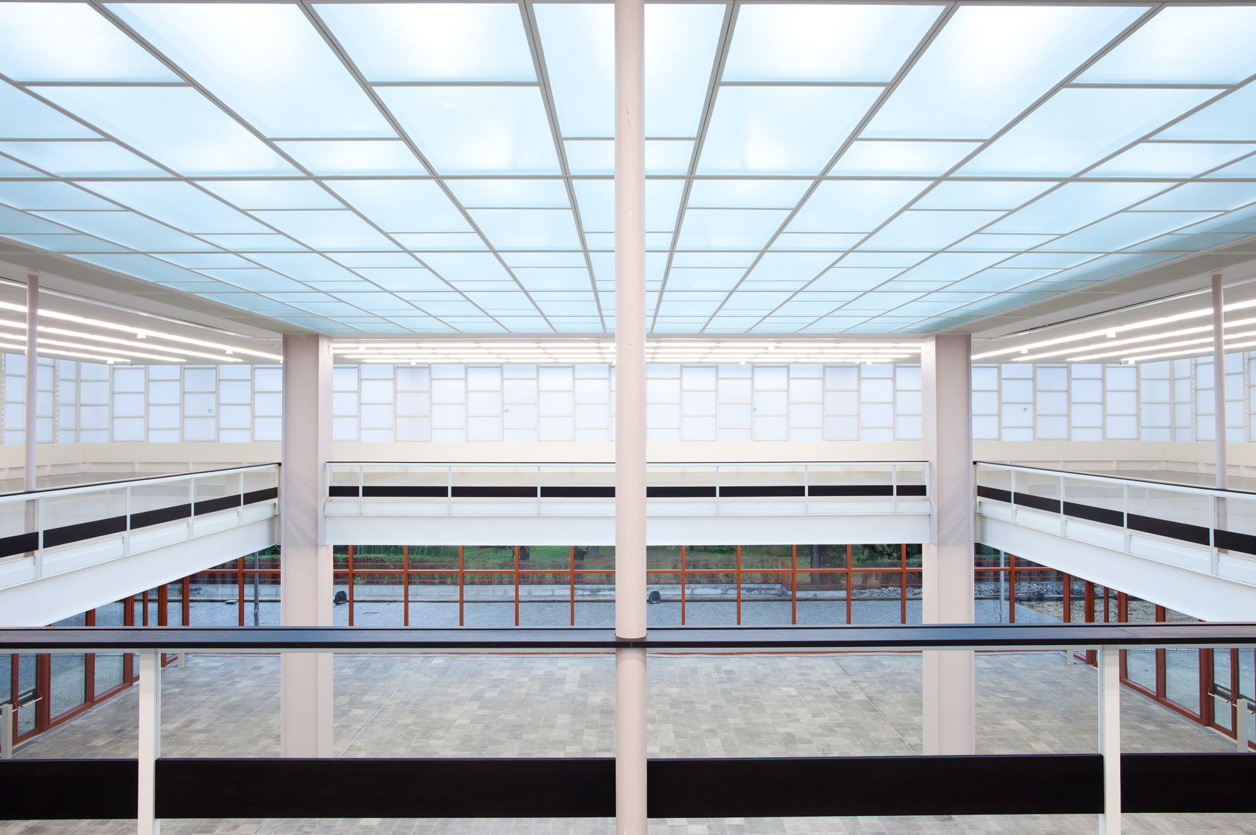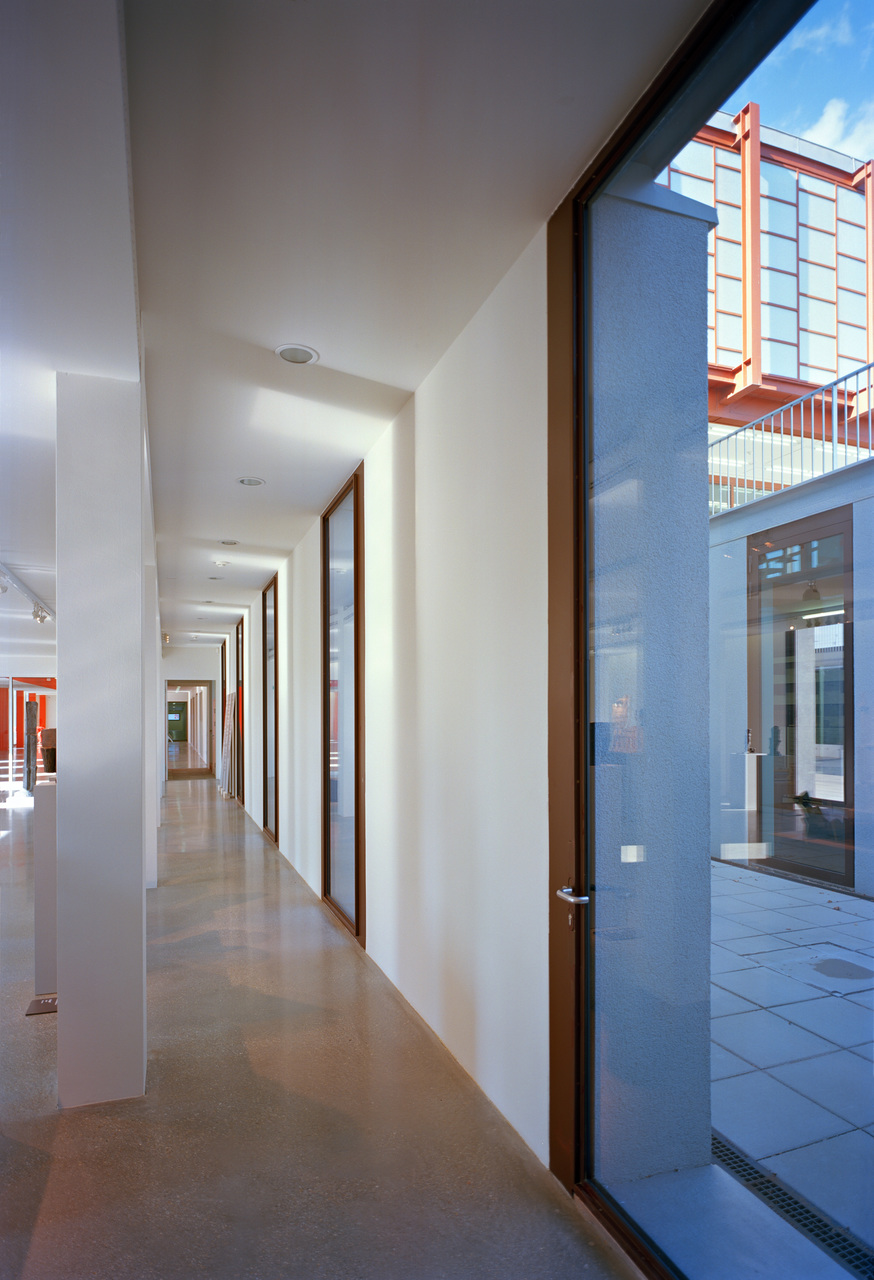 Nicht alle Renovierungsmaßnahmen konnten so nahe am Original erfolgen. Wo sich zuvor offene Geländerbrüstungen befanden, müssen heute Glaspaneele vor Abstürzen schützen. Auch die Brüstungshöhe des Geländers im ersten Stock musste adaptiert werden, da die geltende Bauordnung ein höheres Geländer vorschreibt. Der Architekt Adolf Krischanitz fand eine Lösung, die den offenen Raumeindruck nicht einschränkt. Die erforderlichen zusätzlichen Zentimeter wurden nicht in der Vertikalen sondern in der Horizontalen ergänzt, indem das Geländer in den Raum hinein vergrößert wurde und damit den Sicherheitsanforderungen entspricht. Details wie diese lassen keinen Zweifel daran, wie sehr Adolf Krischanitz den Entwurf Karl Schwanzers achtet und schätzt.