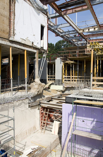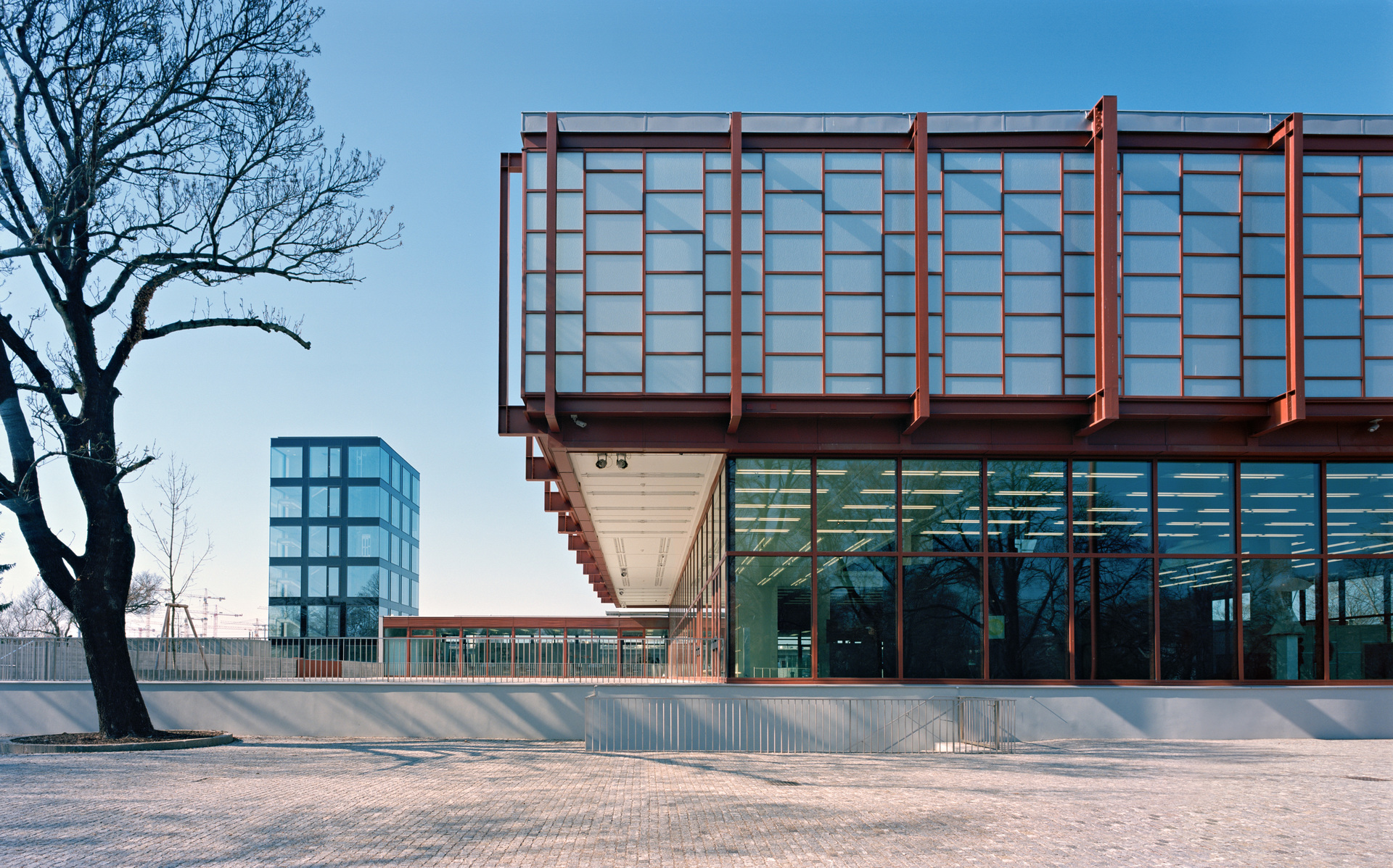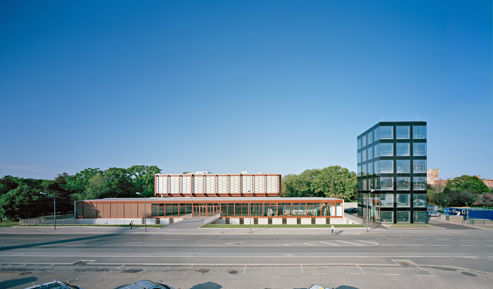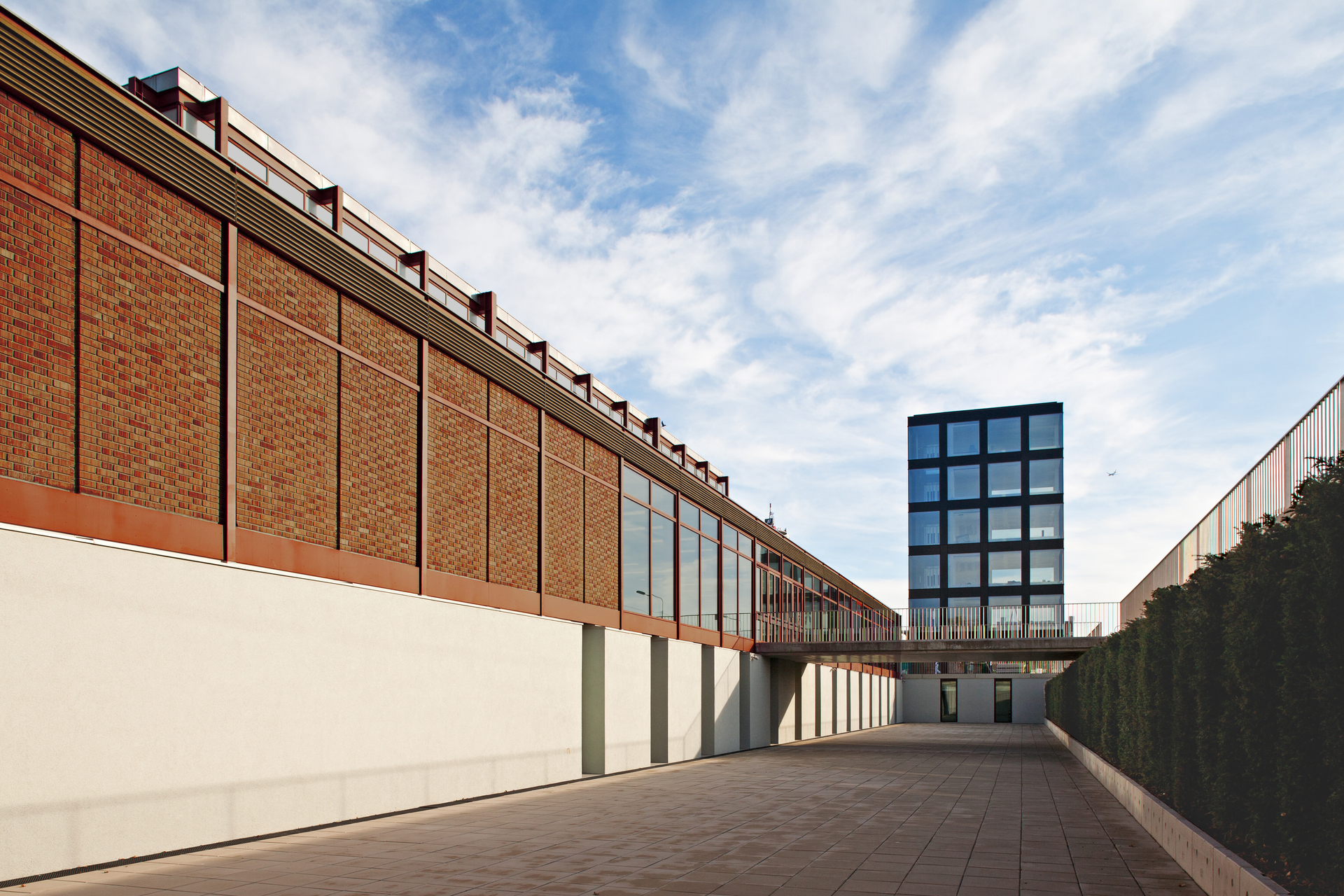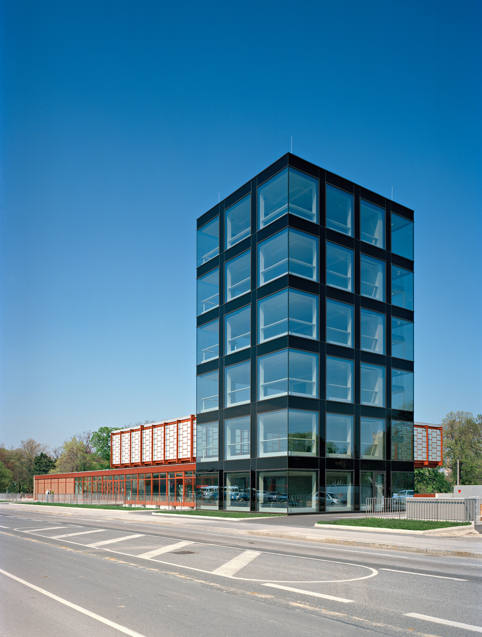 In der Breite des Vorhofes wird der Anlage ein sechsgeschossiger Turm beigestellt, der den erweiterten Bedarf an Flächen für Büros und Verwaltung abdeckt und gleichzeitig weithin sichtbar als Signal wirkt. Der Turm ist mit dem Bestand lediglich unterirdisch verbunden. Seine Fassade zitiert der Raster in der Hülle des 21er Hauses.
