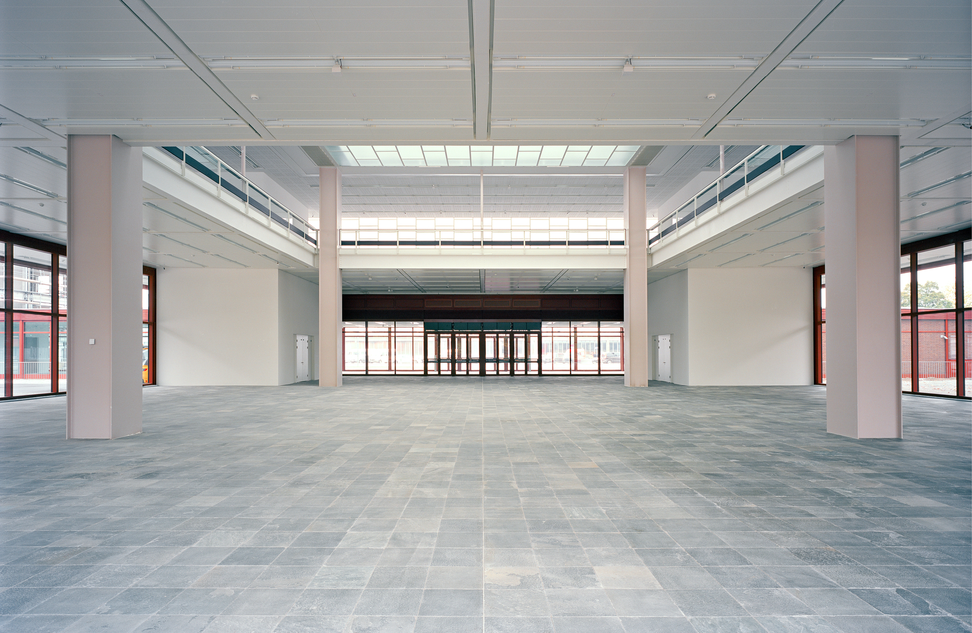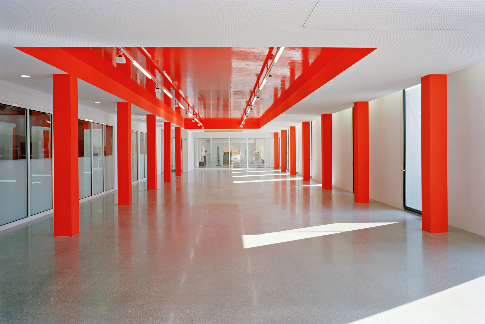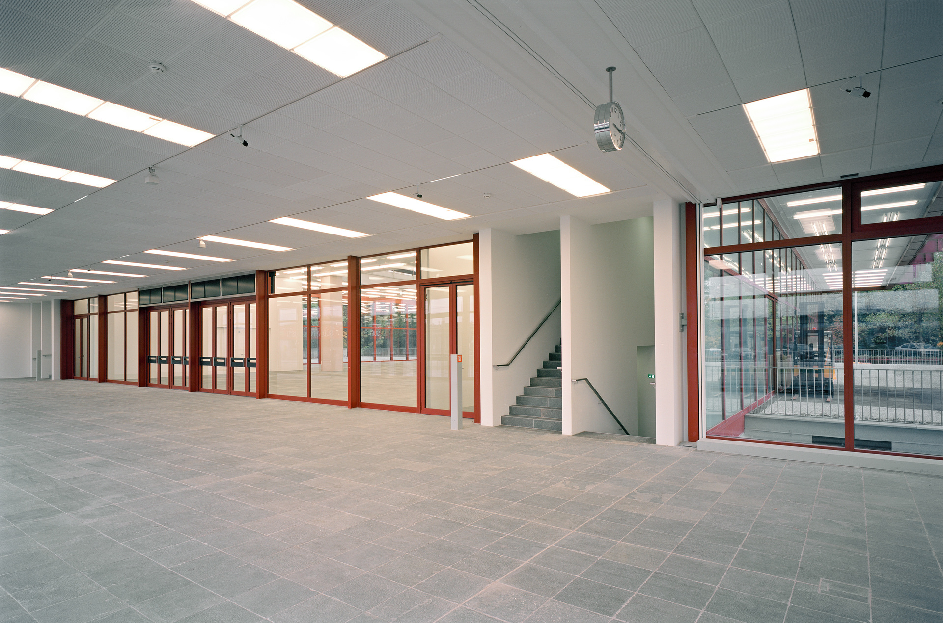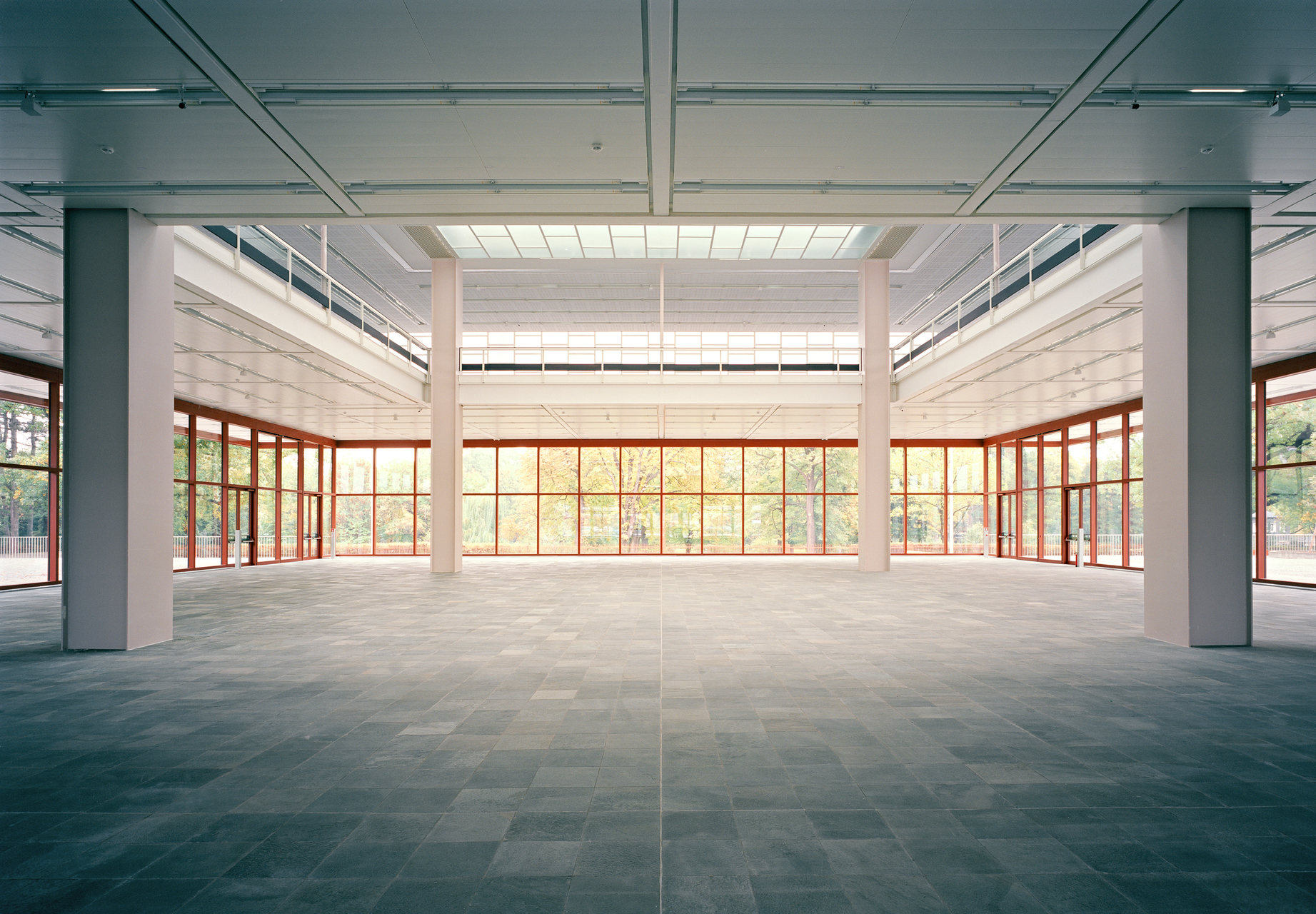 Eine maßgebliche Veränderung ist der zeitgemäßen Bespielung des Hauses geschuldet. Das Obergeschoss bietet vollklimatisierte Ausstellungsflächen, während das Erdgeschoss, die monumentale Mittelhalle mit Sicht auf den Schweizer Garten, zu einem Veranstaltungsraum multifunktionaler Prägung aufgerüstet wurde. Das 21er Haus kann – so wie andere Museen auch – während der Abendstunden als Veranstaltungslocation gebucht werden. Diese Nutzung stellt eine unverzichtbare Einnahmequelle für Museen dar. Für Veranstaltungen gelten strenge Auflagen, insbesondere den Brandschutz betreffend. Diese Mehrfachnutzung bedeutete das Ende der formidablen Freitreppen, die einst in den ersten Stock führten. Heute wird der Besucher durch eingehauste Stiegenaufgänge in den ersten Stock geschleust. (Text: Martina Frühwirth nach einem Text des Architekten)