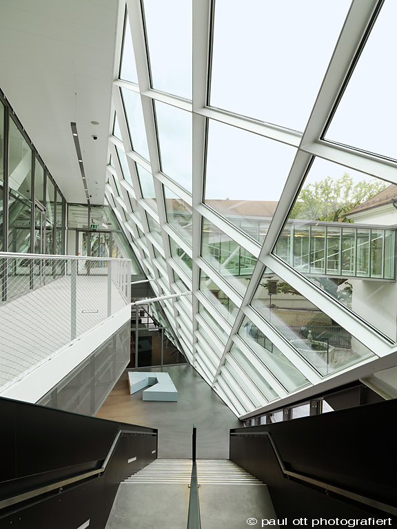 Während die geböschten Fassaden im Hof den Eindruck einer proper geschnitzten Skulptur vermitteln (man könnte auch an ein liegendes Hochhaus von I. M. Pei denken), regiert in den Innenräumen die hohe Schule des Sichtbarmachens. Hinter rautenförmigen Gläsern und schimmerndem Streckmetall geht's ans Eingemachte: Dicke Fachwerksträger durchwandern den Ausstellungsraum im Obergeschoß, die eingesetzten Materialien sind unverputzt und unverblümt, über der grob gelochten Akustikdecke zeichnen sich die Konturen von Lüftungsrohren und Leitungen ab. „Das ist ein Museum, in dem technische Exponate ausgestellt werden“, erklärt Martin Emmerer, „warum sollten wir also nicht auch das Innenleben des Hauses zur Schau stellen?“