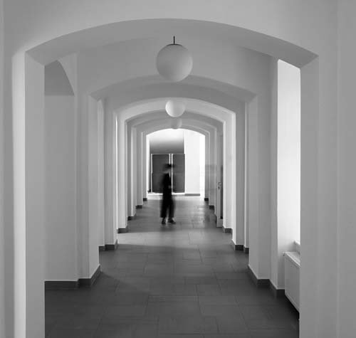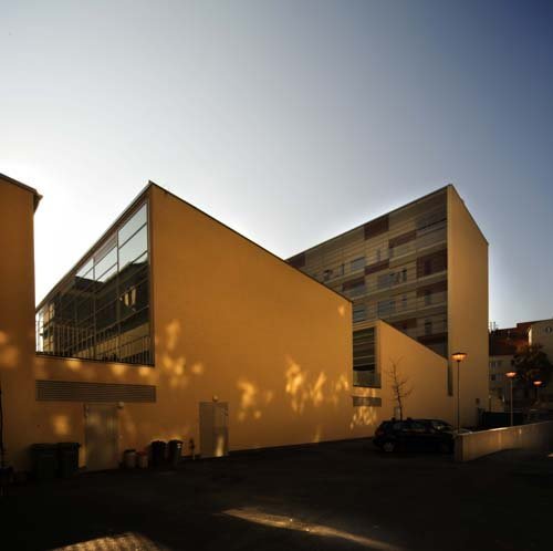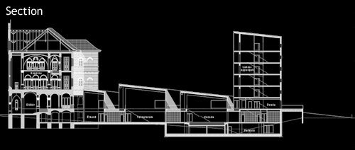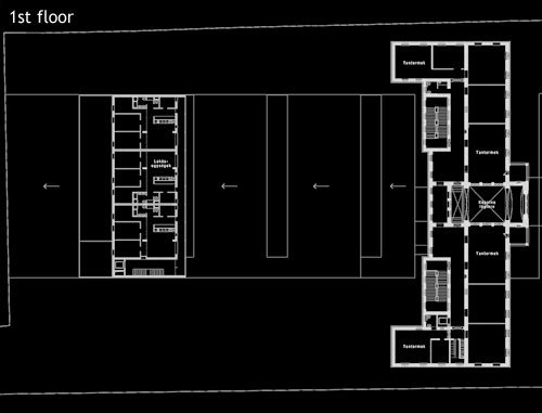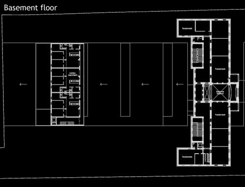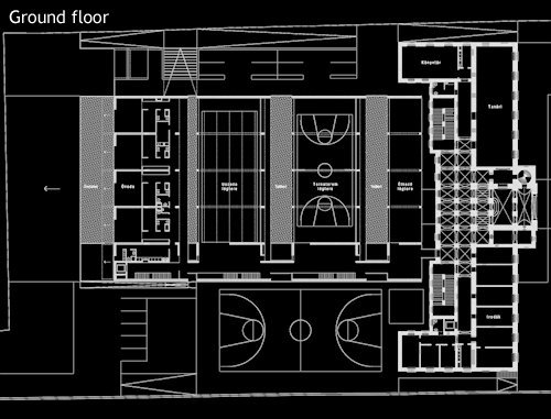 Between the two higher wings the waving, terrain-like edifice encompass the bigger community spaces: the atrium and the adjacent dining hall with the 300 portion kitchen, the sports-hall and the gym-rooms and furthermore a 25 m practice swimming pool. Parking is solved in the underground garage. The dining and the sport facilities are on an semi-underground level, from the ground floor only an insight is possible into these rooms. Besides, the in-between building serves as a connecting link between the educational and the housing wings, a link that also stitches these common spaces and facilities – together with an open-air sports courtyard serving for other common events too. (according to the architect's text)