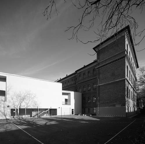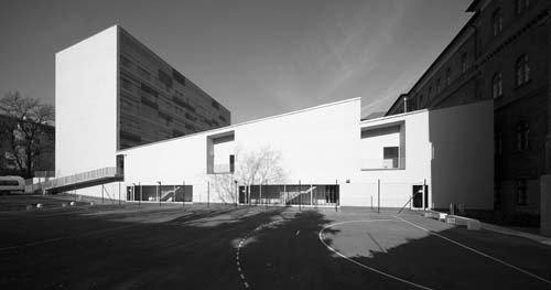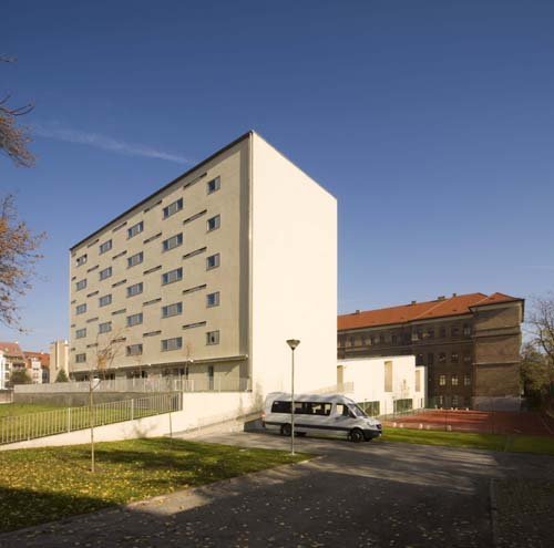 The client – the Municipality of the capitol – wished to place a building-complex on the plot for the education and housing of mentally moderately disabled children. The complexity of the required functions precluded the use of the existing buildings – the turn-of-the-century brick main building and the annexing building form the seventies – without significant architectural intervention. The program claimed the total demolition of the annex, creating the possibility for a foundation of a new architectural image, which is both acceptable and justifiable in this protected surrounding.