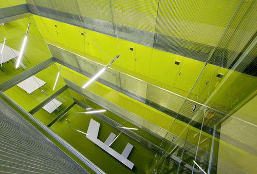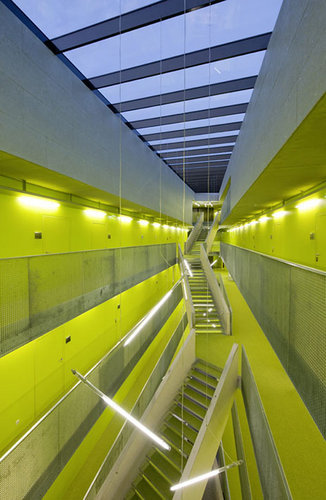Um jene Raumsituationen, die als Treffpunkte genutzt werden können, nicht nur im Außenbereich, sondern auch im Inneren fortzuführen wurden die einzelnen Riegel als zweihüftige Bauwerke konzipiert. Der verglaste Mittelbereich lässt über eine innen liegende Halle nicht nur das Licht bis in die unteren Geschoße fallen, sondern schafft auch kommunikative Flächen.