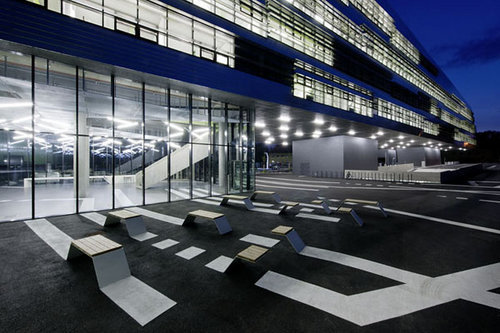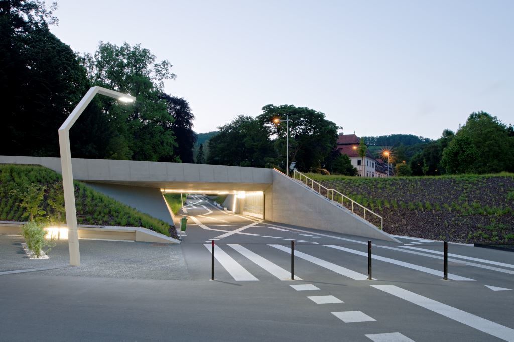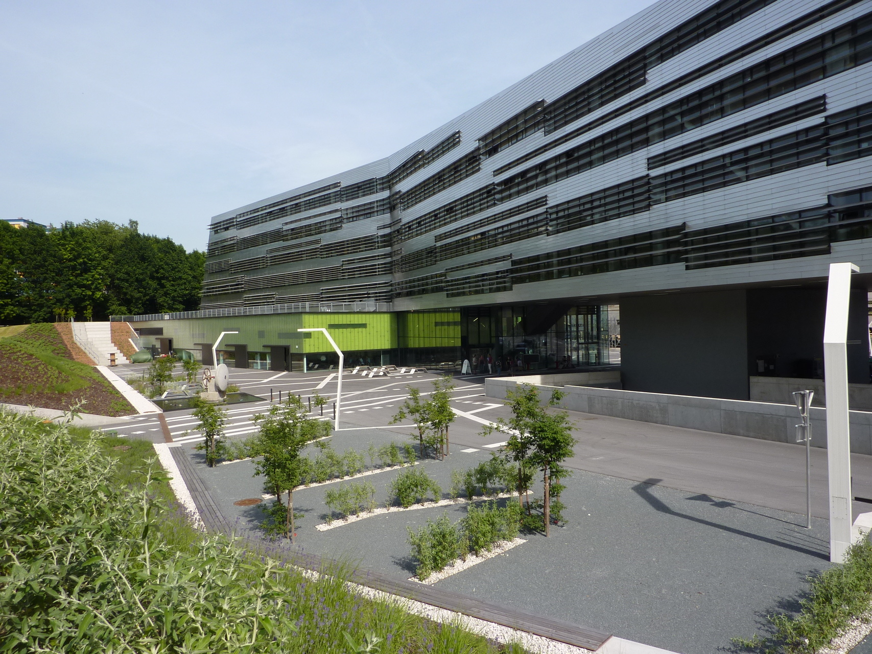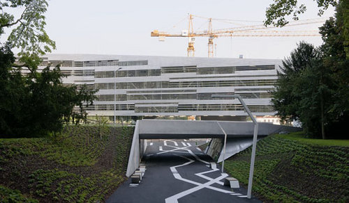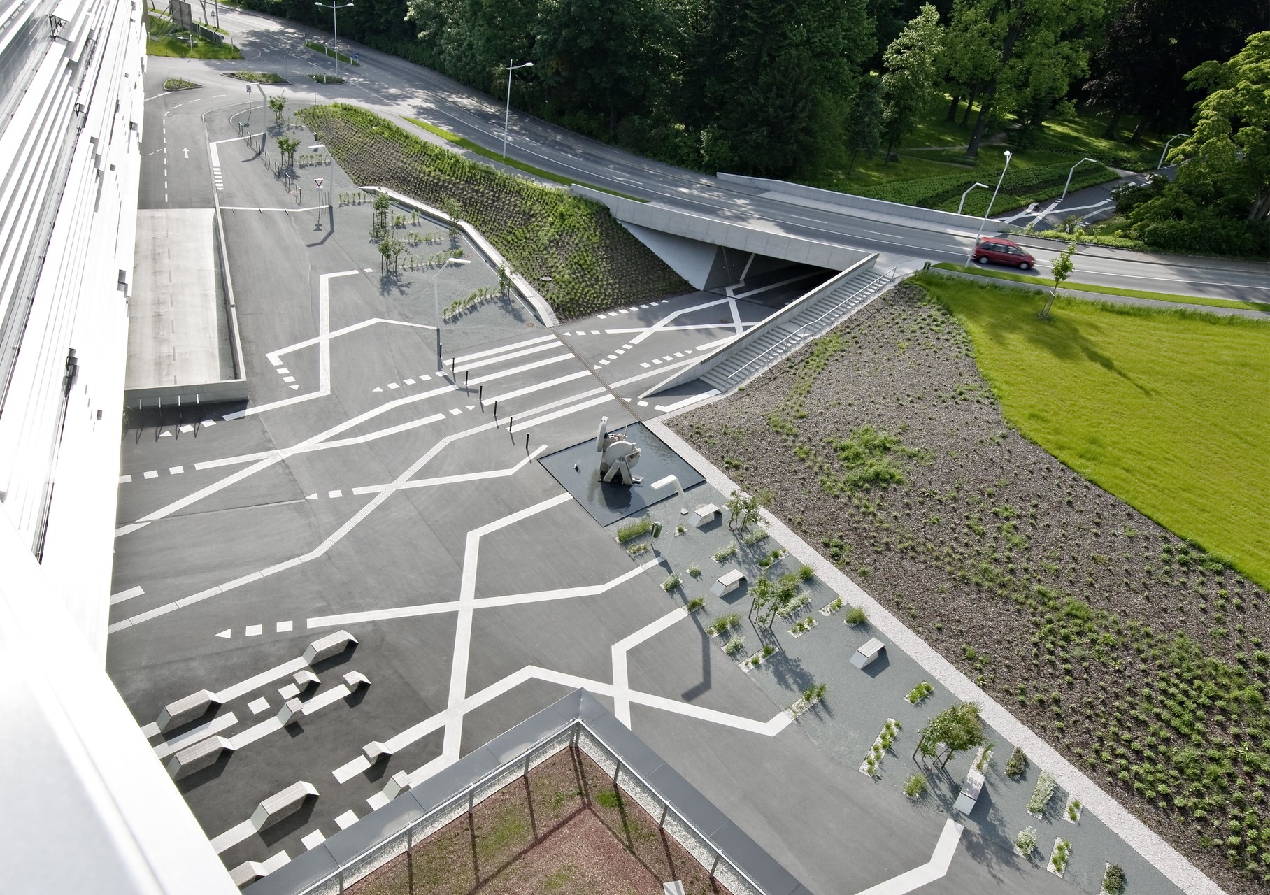 Die horizontale Verknickung schließlich ergibt sich aus der Rücksichtnahme gegenüber den bestehenden Bebauungen. So übernimmt die Höhenentwicklung des Gebäudes einerseits die Hangoberkante im Norden, und andererseits die Traufenkante der südlichen Wohnbauten. Dass die Südseite nochmals nach hinten knickt, ist aber nicht nur ein Entgegenkommen den Nachbarn gegenüber, sondern Teil eines Spiels mit der Vorderkante, die in der Summe der Bauetappen letztendlich zur modulierten Form wird. Insgesamt war es wichtig, dass sich das Projekt in das Gelände „duckt“. Deshalb wurde der Hang abgegraben und an der Hangseite ein Sockelgeschoß errichtet, das die Sonderräume wie Werkstätten beinhaltet und die einzelnen Bauetappen miteinander verbindet. Darüber schweben die Bürotrakte, zwischen denen die Landschaft in das Areal fließt. Eine Maßnahme, mit der auch die schwierige Anbindung an den bestehenden Campus gelöst wurde, trennt doch die stark befahrene Altenbergerstraße beiden Areale. Dass Gelände wurde so weit abgesenkt, dass man auf der Seite des Science Parks zur ebener Erde in eine Unterführung kommt, die auf der Seite des Uni-Campus mit einer langen Rampe langsam durch den Park bis unmittelbar vor die Gebäude führt. Damit ist die Anbindung zumindest teilweise ebenerdig.