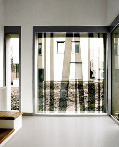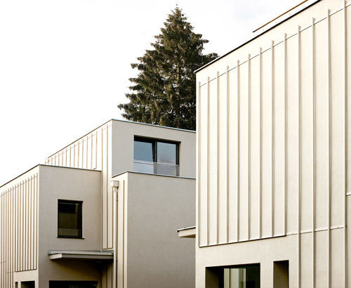 Unterschiedliche Öffnungen betonen den Ausblick nach draußen, als großflächige Eckverglasung oder als schmaler Fensterschlitz. Immer wieder laufen Blickachsen durch das ganze Haus – so kann man im Wohnraum oder im Essraum nach allen vier Himmelsrichtungen nach draußen sehen. Vertikal fällt das Licht über Oberlichtfenster oder Wandschlitze über das Stiegenhaus ein. Die Fassaden der Häuser sind in fünf unterschiedlichen, leicht abgestuften Farbtönen gestrichen – in gebrochenem Weiß mit zusätzlichen Gelb- oder Rotanteilen bis zu hellem Grau. An sonnenorientierten Fassadenflächen ist an der Oberfläche eine Glimmerlasur aufgetragen – je nach Sonnenlichteinfall und Baukörper verändern sich dadurch die Fassadenflächen und beginnen leicht zu glitzern.