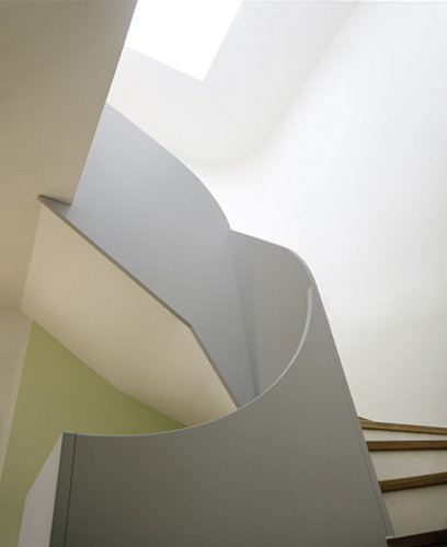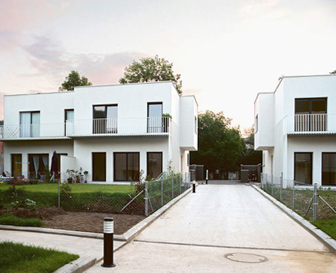 Auf dem engen Bauplatz stehen die Häuser dicht beieinander. Die Baukörper sind nach Lage und Ausrichtung entwickelt, Vor- und Rücksprünge werden von der Orientierung der Räume und Terrassen, den Himmelsrichtungen und den Nachbarhäusern beeinflusst.