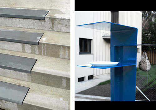 An den straßenseitigen Fassaden der Häuser sind vertikale Rankgerüste aus farblich beschichteten Aluminiumprofilen angebracht. Für Pflanzenbewuchs gedacht, lockern sie durch Profil und Schattenwurf die eher kühlen und geschlossenen Nordfassaden auf - auch wenn sie unbewachsen bleiben. Dem rauen Klima des Wienerwaldes entsprechend haben wir einfach und kräftige Materialen für den Außenraum gesucht: Die Terrassenstufen sind Betonfertigteile mit eingelegten massiven Naturschieferplatten. Die Fensterbänke der tiefsitzenden erdgeschoßigen Eck- und Fixverglasungen sind aus Beton gegossen, ohne zusätzliche Verblechungen können sie für Blumen und Pflanzen genutzt werden. Der mittlere Erschließungsweg ist aus Ortbeton, die Oberfläche wurde – ähnlich wie bei Terrazzoböden üblich – mechanisch gestockt. (Text: Architekten)