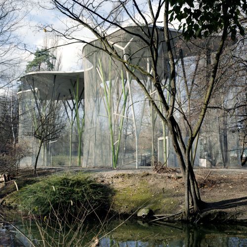 In einem kleinen Waldstück mit Teich mitten in der Stadt Genf steht diese federleichte Voliere, die sich in ihrer Struktur ganz den umstehenden Bäumen angleicht. Die aus Stahlrohr verschweissten Baumstützen folgen nur scheinbar einem natürlichen Wuchs – dahinter steckt ein raffiniertes Modell für die Optimierung des Tragsystems, das sich von Untersuchungen des spanischen Architekten Antonio Gaudì herleitet.Der leichte, netzumspannte Raum, der mit dem umgebenden Wald zu einer Einheit verschmolzen scheint, definiert sich durch ein Dach in freier Form, welches von 16 baumartigen Stahlstützen getragen wird. Die Kontur des Daches folgt der Begrenzung durch die umstehenden Bäume und formt damit ebenfalls eine Art Baumkrone. Die 9 Meter hohen Baumstützen sind in einem Raumgitter in Form eines stehenden Quaders eingeschrieben, welches die notwendigen Bezugspunkte für die Planung, Herstellung und Montage liefert. Die Baumstützen wurden je nach Kräftefluss mit Rundrohren in verschiedenen Wandstärken ausgeführt und in hellen Grün- und Weisstönen gestrichten. Eine filigranes, fast unsichtbares Netz aus Edelstahl hüllt die Baumstruktur in eine Art Spinnengewebe ein, das wiederum die Einbettung in die Natur thematisiert.