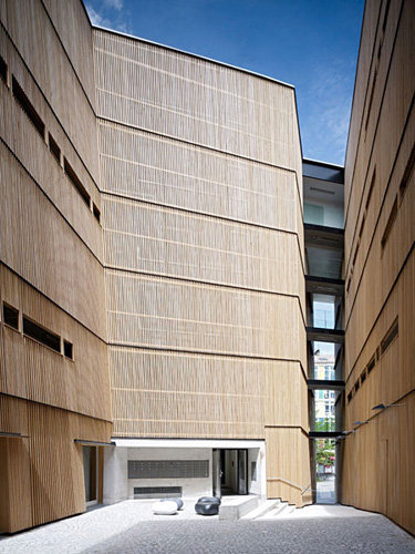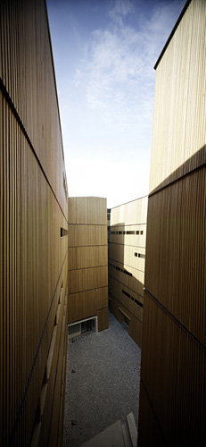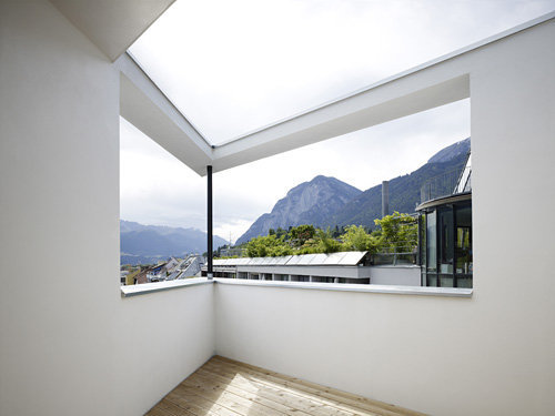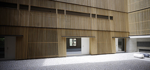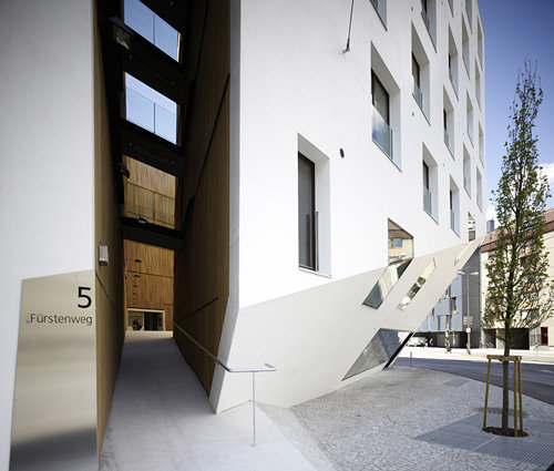 Ein haushoher Eingangsschlitz führt in die komplett andersartige „Innenwelt“ des Baukörpers, wo zwei geknickte, gegeneinander verschobene, schräge Wandscheiben einen eigenständigen Raumkörper bilden. In Bezugnahme auf Hofsituationen in der Altstadt schufen die Architekten hier einen urbanen, mit Stöcklpflaster ausgelegten und von breiten Laubengängen erschlossenen „Gassenplatz“. Im Kontrast zum kristallinen Äußeren – glatter Feinputz überzogen mit einer glänzend weißen Farbe – sind die Innenhoffassaden mit vertikalen Eichenlamellen verkleidet. (Text: Claudia Wedekind)