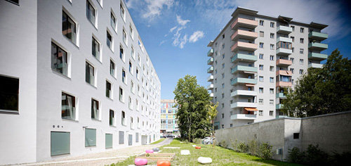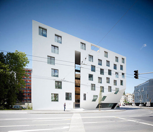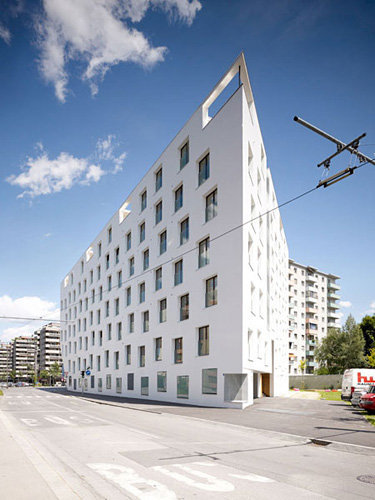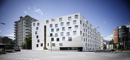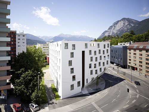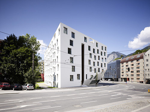 In der Höttinger Au errichteten Gerhard Manzl, Johann Ritsch und Manfred Sandner einen vorrangig für studentische Nutzer konzipierten Wohnbau mit Büroflächen bzw. einer Gastronomie im Erdgeschoss. Räumlich wie inhaltlich bezieht sich das Projekt auf den Typus der Inn-Salzachstädte und erinnert in seiner Grundhaltung an deren Ambivalenz von Außen und Innen.Nach außen präsentiert sich der an der Universitätsbrücke gelegene Solitär als auffälliger Monolith mit einer markant abgeschnittenen Ecke und rhythmisch versetzten Fensteröffnungen. Angesichts der komplexen Außenraumbedingungen des Bauplatzes erschien eine Weiterführung der umgebenden orthogonalen Stadtstruktur nicht zielführend. Im beabsichtigten Bruch mit der aus den 1960er und 1980er Jahren stammenden Bebauung wurde deshalb ein Baukörper entwickelt, der nach allen Seiten differenziert auf den Straßenraum reagiert.