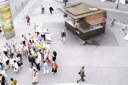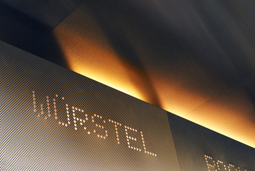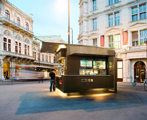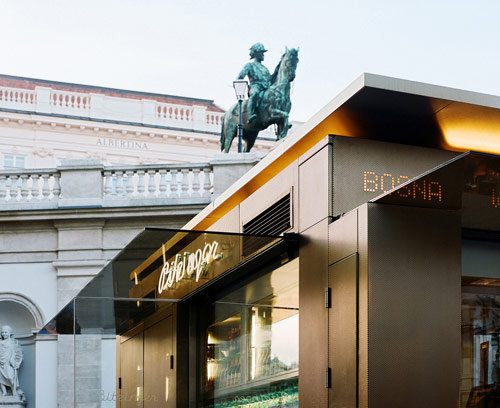 Auf eine feine Detaillierung legten die Architekten bei dieser kleinen Bauafgabe besonderes Augenmerk: Die Verkleidungen und Fassadenbleche sind gefalzt und plastisch um die Ecke geführt, die rahmenlosen Glasscheiben verdeckt in die Konstruktion eingeschlitzt, die auskragenden Glasdächer wurden ohne Abspannungen oder Rahmen als eingespannte Scheiben ausgeführt. Das mustergewalztes Edelstahlblech, das speziell in einem Werk in England gefertigt wird, changiert je nach Lichteinfall von einem dunklen Champagnerton bis zu hellem Messingglanz. Bei der Beschriftung ging es auch um eine maximale Wiederkennbarkeit. „Um den Schwung des klassischen Neonschriftzugs am Dach gut zu treffen, legte die Grafikerin Eleonore Bujatti ihre Entwürfe mit Wollfäden auf Stoffunterlagen, danach wurde der Entwurf digitalisiert.“ Zwei kleine Monitore in der Fassade können unterschiedlich bespielt werden – mit dem Tagesangebot, Opernübertragungen oder kleinen, künstlerischen Videos. (Text: Gabriele Kaiser)
