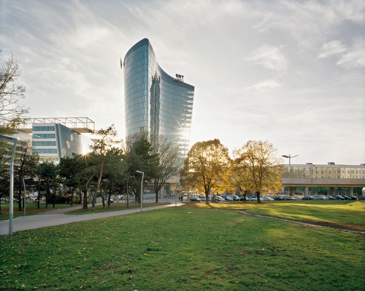 Die Form des Hauses hat eine Vorgeschichte. Es gab einen städtebaulichen Wettbewerb, den Henke und Schreieck mit einem Konzept gewonnen haben, das eine durchgängige Bebauung mit konvex/konkav geformten Baukörpern vorgesehen hätte. Lauter Bumerange – oder wie es Margherita Spillutini formuliert: „Kipferl“. Solche Baukörper ermöglichen trotz hoher Dichte Durchlässigkeit – auch in Bezug auf den Ausblick – und die Formulierung spannender Außenräume. Die sind wichtig, und sie kommen bei uns regelmäßig zu kurz. Trotzdem wurde das Konzept zugunsten einer anderen, nicht zuletzt durch die Landschaftsplaner mitbestimmten Lösung aufgegeben. Der OMV-Bumerang ist daher durch eine Brücke mit dem durchaus rechtwinkligen Nachbarn von Martin Kohlbauer verbunden, nur vier verhältnismäßig niedrige – bumerangförmige – Baukörper von Henke und Schreieck schräg gegenüber gehen noch auf das ursprüngliche Städtebau-Projekt zurück.