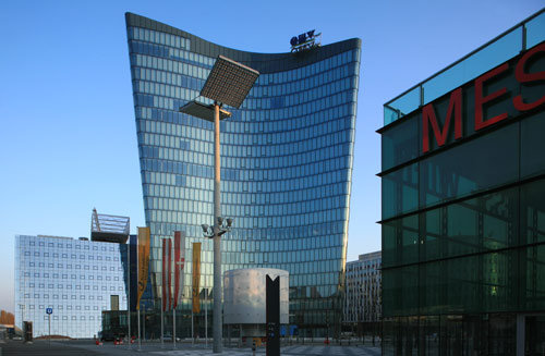 Eines vorweg: Es ist keine schlanke, hohe Nadel, die Henke und Schreieck geplant haben. Das Haus steht fest auf der Erde und ist mit seinen 80 Metern Höhe möglicherweise sogar zu niedrig. Aber die diversen Kubaturen der Gebäude wurden natürlich im Vorfeld des komplexen Wettbewerbsverfahrens festgelegt, daran war nicht zu rütteln. Andererseits sagen die Architekten, dass ihr Haus nicht Raum besetzt, sondern Raum bildet. Das ist zumindest teilweise richtig. Denn es besteht aus einem konkav/konvex gebogenen Baukörper, der einen großzügigen Vorplatz definiert (übrigens möbliert mit einer wunderbaren, amorphen, grünen Plastik von Lois und Franziska Weinberger). Es nimmt viel Grundfläche ein, wenn man es mit herkömmlichen Hochhäusern vergleicht. Dafür kann es umso mehr.