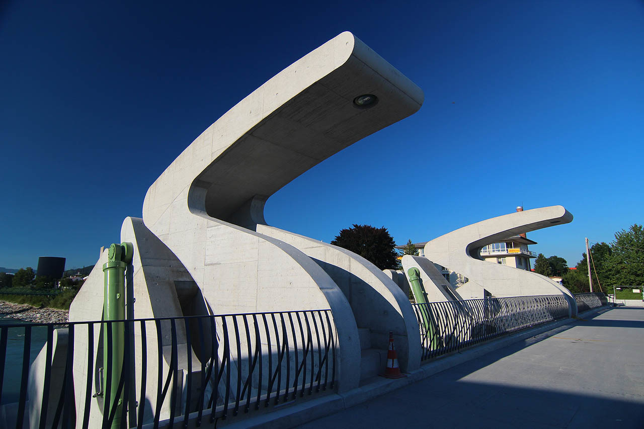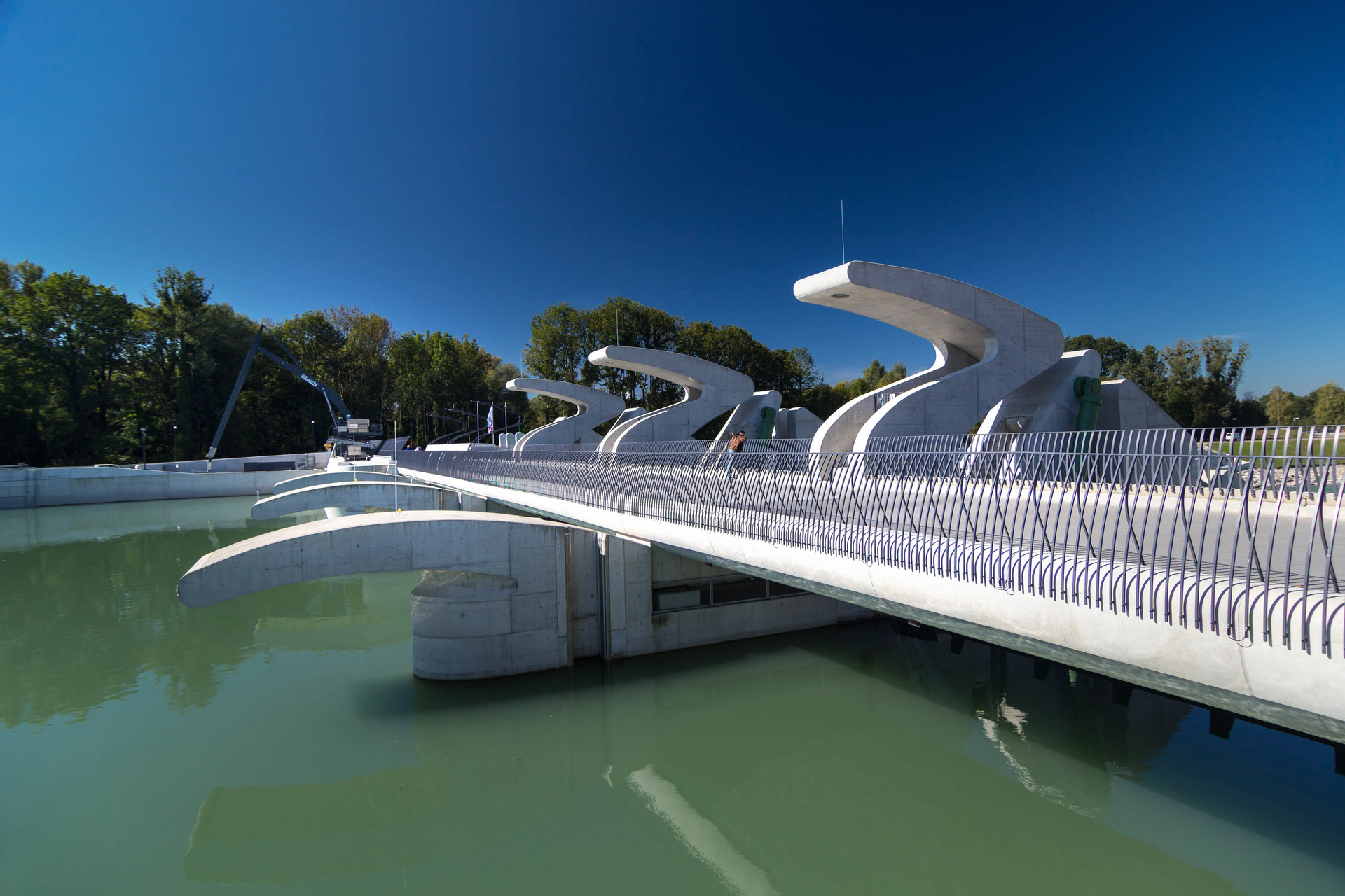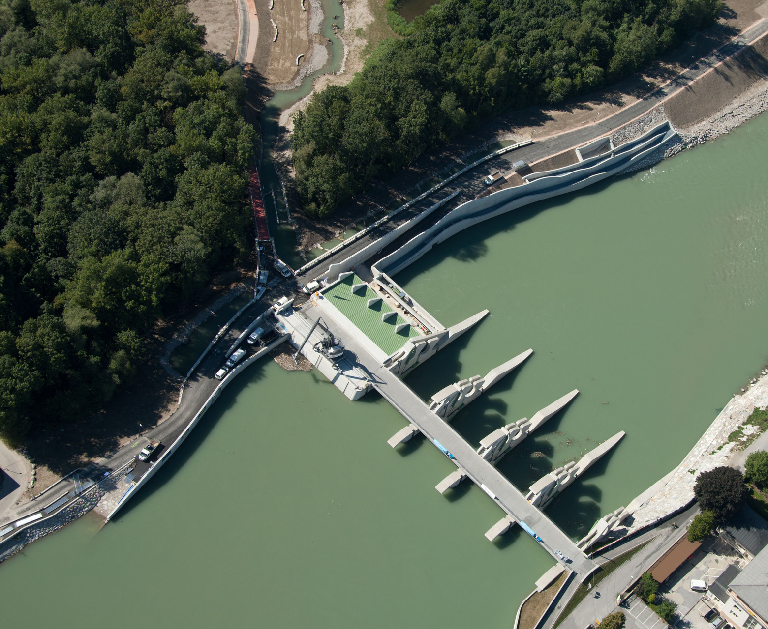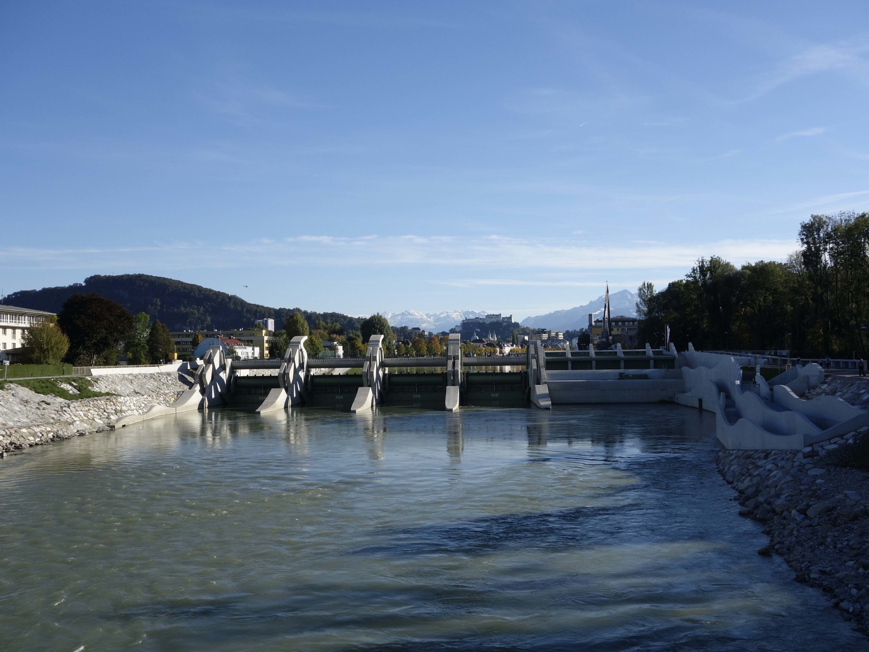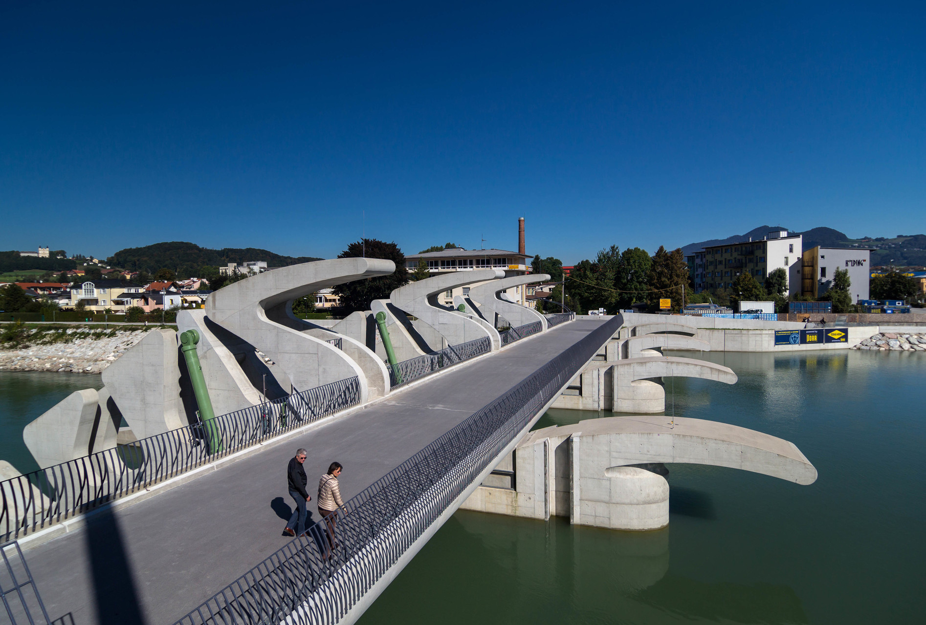 Im geladenen Wettbewerb, den die Salzburg AG ausgeschrieben hatte, blieben nach der ersten Phase noch zwei Projekte übrig, die völlig unterschiedlich an die Aufgabe herangingen. Dietmar Feichtinger, aus Graz stammender Architekt mit Büro in Paris, gestaltete das Kraftwerk als schöne Maschine: Die Wehrpfeiler stemmen sich gegen die Wasserwand, alle Energie fließt ins Krafthaus, dessen elegant abgerundeten Kanten eine eigenständige Figur am Ufer am Auwald bildet. Die Verbindungsbrücke ist eine leichte Stahlkonstruktion mit aufgelöstem Tragwerk, über dem mittig eine befahrbare Betonplatte mit beiderseitig begleitenden, begehbaren Holzrosten liegt.
