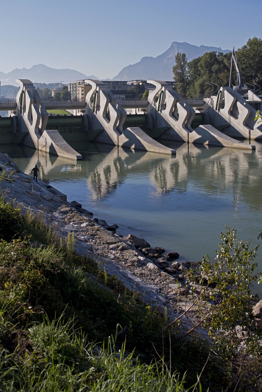 Die Lehre aus solchen Entwicklungen kann nur darin bestehen, die saubere Trennung zwischen Schönheit und Nützlichkeit aufzugeben und auch Infrastrukturbauten von Anfang an als sowohl technische wie gestalterische Problemstellungen zu behandeln. Wie produktiv die Diskussion sein kann, in die man dabei gerät, zeigt der soeben entschiedene Wettbewerb für das neue Flusskraftwerk im Salzburger Stadtteil Lehen. Ähnlich wie beim Beispiel der Lärmschutzwände geht es auch hier nicht nur um den primären Nutzen, nämlich die Energiegewinnung, sondern zugleich um die Sanierung von Umweltfolgen. Denn an sich liegt die erreichbare Fallhöhe des Wassers an dieser Stelle mit 6,5 Metern deutlich unter dem Wert von neun bis zehn Metern, ab dem üblicherweise ein solches Kraftwerk errichtet wird. Sein Zweck besteht allerdings nicht nur in der Energiegewinnung, sondern auch in der Erhaltung des Schotterbetts der Salzach, das inzwischen gefährlich dünn geworden ist. Würde die Strömung nicht durch eine neue Staustufe verlangsamt, wären umfangreiche und teure Sanierungsmaßnahmen an der Fluss-Sohle nötig gewesen, um die Gefahr eines Einbruchs der Uferböschungen zu verhindern.