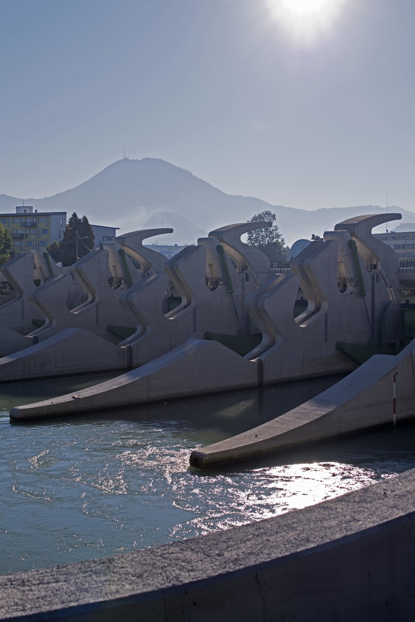 Erich Wagner und Max Rieder geht es dagegen vor allem darum, die Kraft des Flusses zu zeigen, als würde er über die Schwelle stürzen und sprudeln. Ihre Wehrpfeiler sind weit flussabwärts gezogen, wie von der Strömung mitgerissen, und bäumen sich über dem Wehr zu mächtigen, zur Stadt blickenden und von dort sichtbaren Skulpturen auf. Im Projekt der ersten Stufe bestanden diese Skulpturen noch aus zwei Teilen, 70 Meter langen, schmalen Metallsegeln, die auf dynamisch geformten Wehrpfeilern aus Beton auflagerten. Im endgültigen Projekt sind die Wehrpfeiler deutlich verkürzt, die Skulpturen vereinfacht und aus den Metallsegeln ist eine spiegelnde Verblechung der Schnittflächen geworden. Rüdiger Lainer, der Vorsitzende der Jury, hatte Max Rieder in Anspielung an zwei Barockarchitekten unterschiedlichen Temperaments ersucht, sein Projekt in der Überarbeitung „von Borromini in Richtung Bernini zu domestizieren“.
