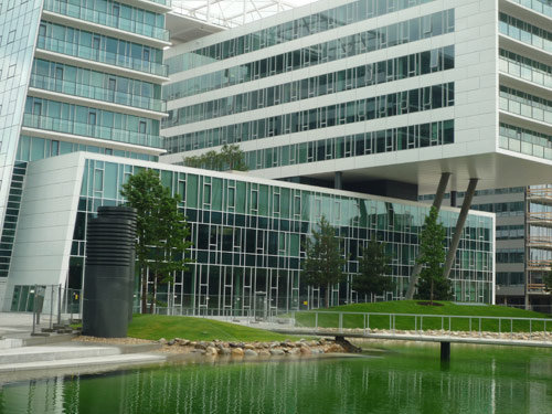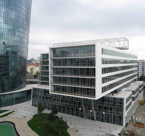Das Bürohaus „Plus Zwei“ (Stahlbetonskellettbau mit Elementfassade) besteht aus einem annähernd quadratischen, 3-geschossigem Sockel mit 9-geschossigem „Schild“ Richtung Westen und zwei auskragenden Riegeln, dem 5-geschossigen „Schwebe-Quader“ mit Ausrichtung zur großen Wasserfläche sowie der brückenartigen „Himmels-Spange“, die die beiden Hauptbaukörper markant rahmt. Mit dieser differenzentierten Höhenstaffelung behauptet sich die Kubatur an der Seite des Turms und vermittelt zugelich zwischen den unterschiedlichen Bebauungshöhen. Zwischen den beiden Bauten gibt es eine interne Verbindung in Form einer Brücke. (Text: Gabriele Kaiser)