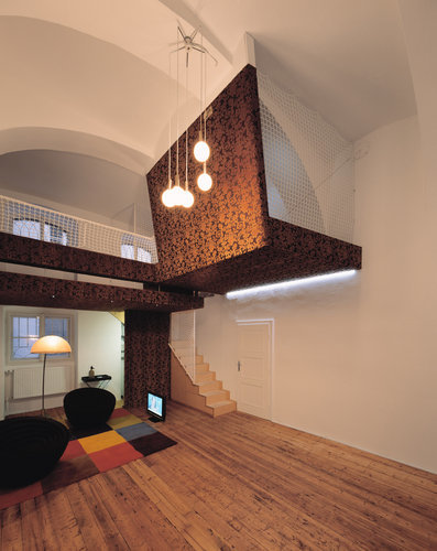 Brauner Samtstoff mit Blumenmuster überzieht einen Teil der Decken und Wände, farblich abgestimmt auf den bereits vorhandenen Holzdielenboden im EG und den rotbraunen Teppich auf der Galerie. Dort ragt das Bett wagemutig in den Luftraum – die Konstruktion wurde anstelle einer Berechnung mit einem Belastungstest vor Ort statisch nachgewiesen –, am Ende schließt das niedrige Kinderspielzimmer »Lümmerland« an. Weiße Netze bilden statt eines klassischen Geländers die Absturzsicherung.