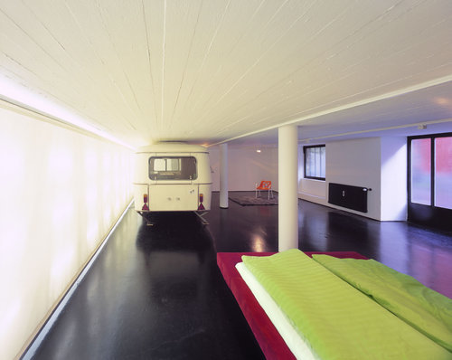 Das Pixel im Hof, in dem u. a. ein Fotolabor, eine Werkstatt und ganz zu Beginn eine Kunsttischlerei untergebracht waren, ist das flächenmäßig größte. Durch eine enge Einfahrt gelangt man zunächst in einen Hof – kaum vorstellbar, dass sich hier, hinter ein paar Stellplätzen und einem Tor, tatsächlich ein Hotelzimmer befindet, vielmehr wirkt es von außen wie eine Garage. Beim Eintreten springen sogleich einzelne Farbakzente und Skurrilitäten ins Auge: ein knallrotes Bett, ein alter Wohnwagen, ein Aufzug. Im Wohnwagen: Teeküche, Sitzecke und weitere Schlafmöglichkeiten, im Aufzug: der Kleiderschrank. Ein dunkler Gussasphalt überzieht den Boden und verstärkt den Loftcharakter des großen Raums, den nur die wenigen Öffnungen zum Hof hin mit Tageslicht versorgen. Die fensterlose Längsseite überspannt eine transluzente Lkw-Plane , dahinter sitzen 36 Röhren, die sich einzeln an- oder ausschalten lassen – die »Lichtorgel« soll an das ehemalige Fotostudio erinnern. Hier schließt am Ende in einer Nische das Bad an, faszinierend: als weiterer Farbkontrast komplett mit kleinen grünen Mosaikfliesen versehen – wiederum ein optisches Highlight.