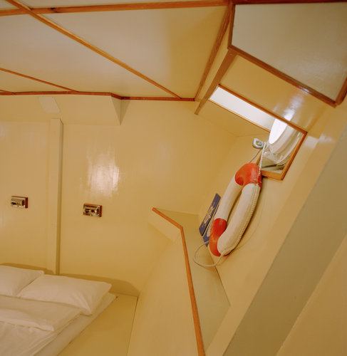 Eine Suite mit Doppelbett, schlicht aber gemütlich, zusammengeschlossen aus zwei ehemals kleinen Kabinen, thront im Unterdeck, vor ihrem Eingang stehen zwei weitere Kabinen ursprünglicher Größe mit Stockbetten bereit. Bei allen Kabinen wurde die Inneneinrichtung original restauriert.
