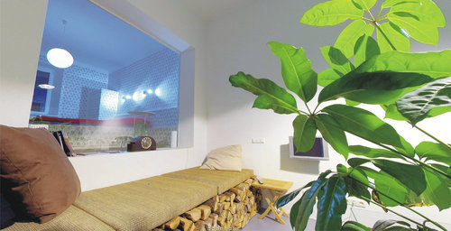 Weiter südlich, im Franckviertel an der Wimhölzelstraße gelegen, an dem ein bogenförmiger Wohnriegel kurz nach dem Ersten Weltkrieg entstand, vereint das Pixel mit Garten eine ehemalige Arbeiterwohnung und ein Geschäft. Im vorderen Teil, der ehemaligen Verkaufsfläche und dem heutigen Wohnzimmer, parken links des Eingangs zwei Fahrräder, die den Gästen des Pixels kostenlos zur Verfügung stehen. Rechts davon gedeiht ein »Garten«, drei große Beete, dessen hohe Pflanzen zumindest etwas vor neugierigen Blicken durch das frühere Schaufenster schützen. Das Schlafzimmer befindet sich in der hinteren Ebene, leicht erhöht wie auch die Sanitärbereiche, die eine Überraschung bereithalten: eine scheinbar zufällig startende, kurze Ton- und Bildinstallation (je nach Benutzen der Lichtschalter einer rätselhaften Logik folgend) verweist auf das benachbarte, öffentliche »Tröpferlbad«. Gespenstisch huschen Stimmen durch den Raum und Zeichnungen über die Milchglaswand, die Badewanne und Minibarbereich trennt.