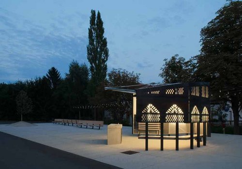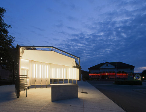Eine große Ankündigungstafel für die örtlichen Vereine und die wiedererrichtete Gedenkstatue für St. Anna sind wichtige lokale Ankerpunkte. Der Pavillon, außen stahlbeplankt mit einer an die Ziegelgitter seines historischen Originals erinnernden Perforierung, innen mit transluzenter Verkleidung, dient als Basisstation für Veranstaltungen und Unterkunft für den Bauernmarkt.