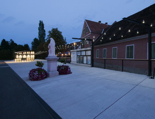 Lange Bänke aus Lärchenholz, Fahrradständer, das aus Lärchenholz gezimmerte „Hügelland“, das Kinder gerne als Spielgerät benützen, und ein Maibaum-Fundament bilden die weitere Ausstattung. Bei Einbruch der Dunkelheit begrenzt die quer zur Gemeindestraße ausgerichtete Lichterkette der „Milchstraße“ den Platz entlang des Baches. (Text: Ute Angeringer-Mmadu nach einem Text der Architekten)