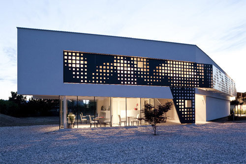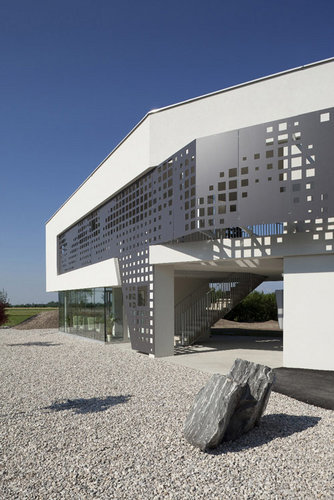 Die vorgehängte Fassade dient sowohl als Witterungsschutz für diesen Erschließungsbereich als auch als Sicht,- und Lärmschutz zur Straße. Die Perforation der Exterior Platten nimmt das Logo des Hotels auf und gibt es in einer verspielten, abstrahierten Form wieder.